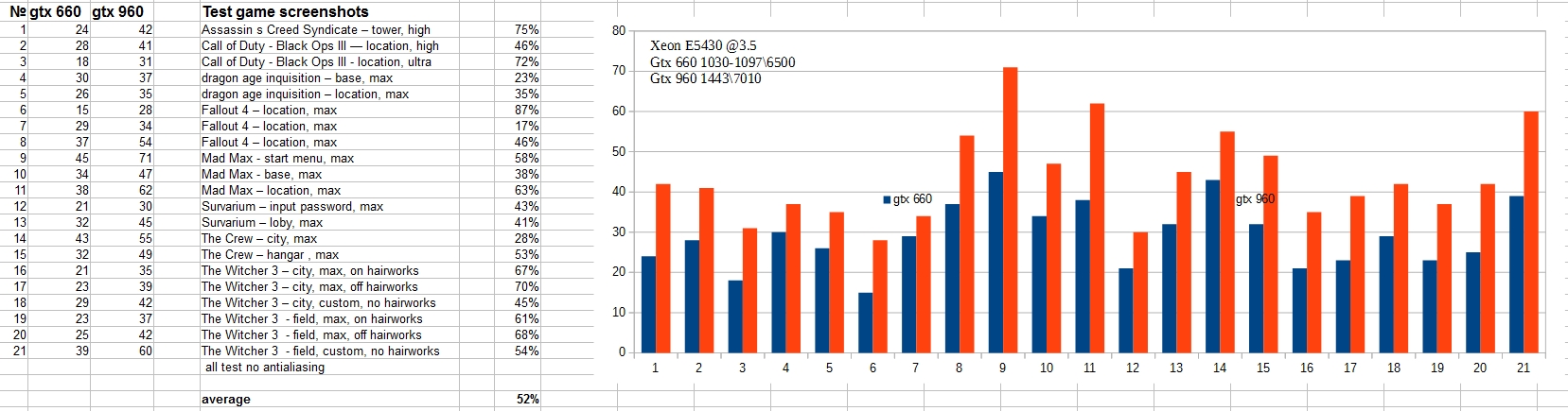 По скриншотам я сравнил разницу в фпс какую я получил при переходе с 660 на 960 при использовании процессора хеон 3.5 В тесте не очень верное сравнения так как это статика, но что-то полезное подчеркнуть можно.