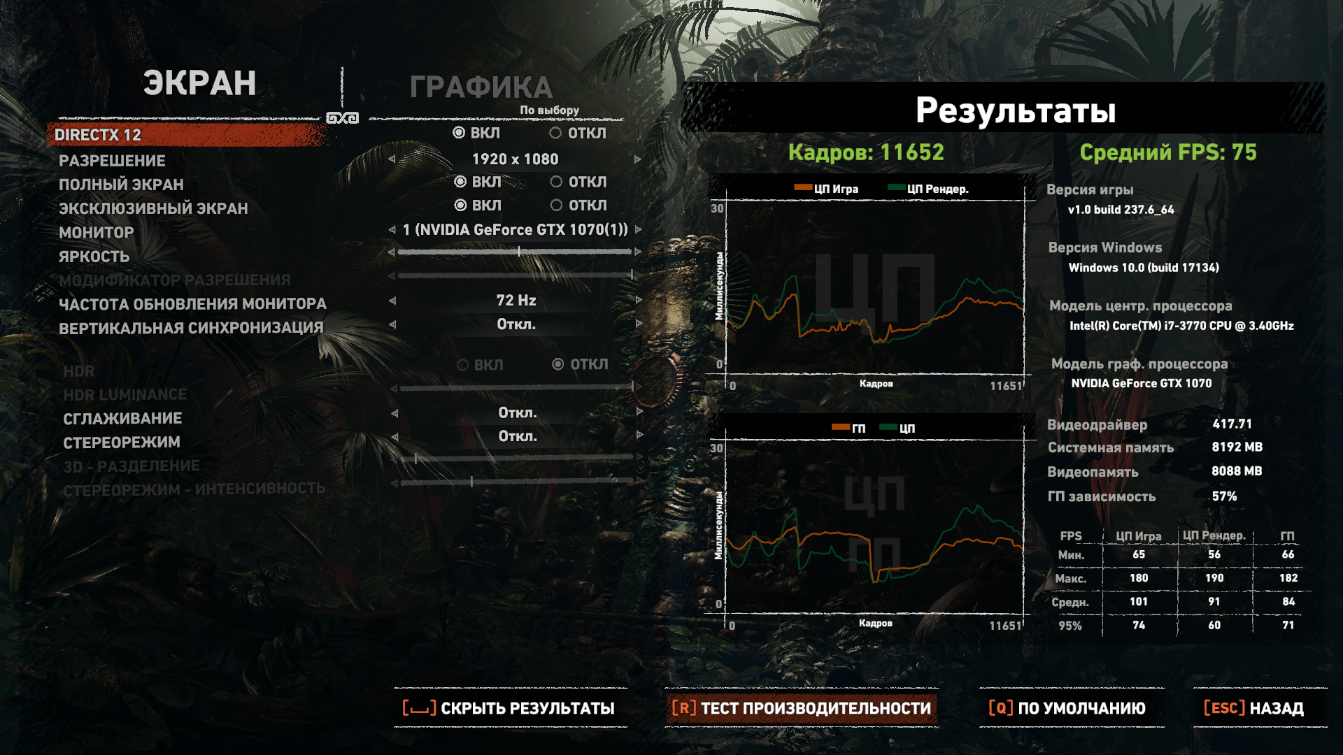 И что встроенный тест показал на 3570К? Вот мой результат на i5-3570K@4300. Правда, у меня 1070ti, но с твоей 1070 практически равны, сделай поправку на эту разницу. Перекачаю игру заново и сделаю повторный тест уже на i7-3770@4100, выложу