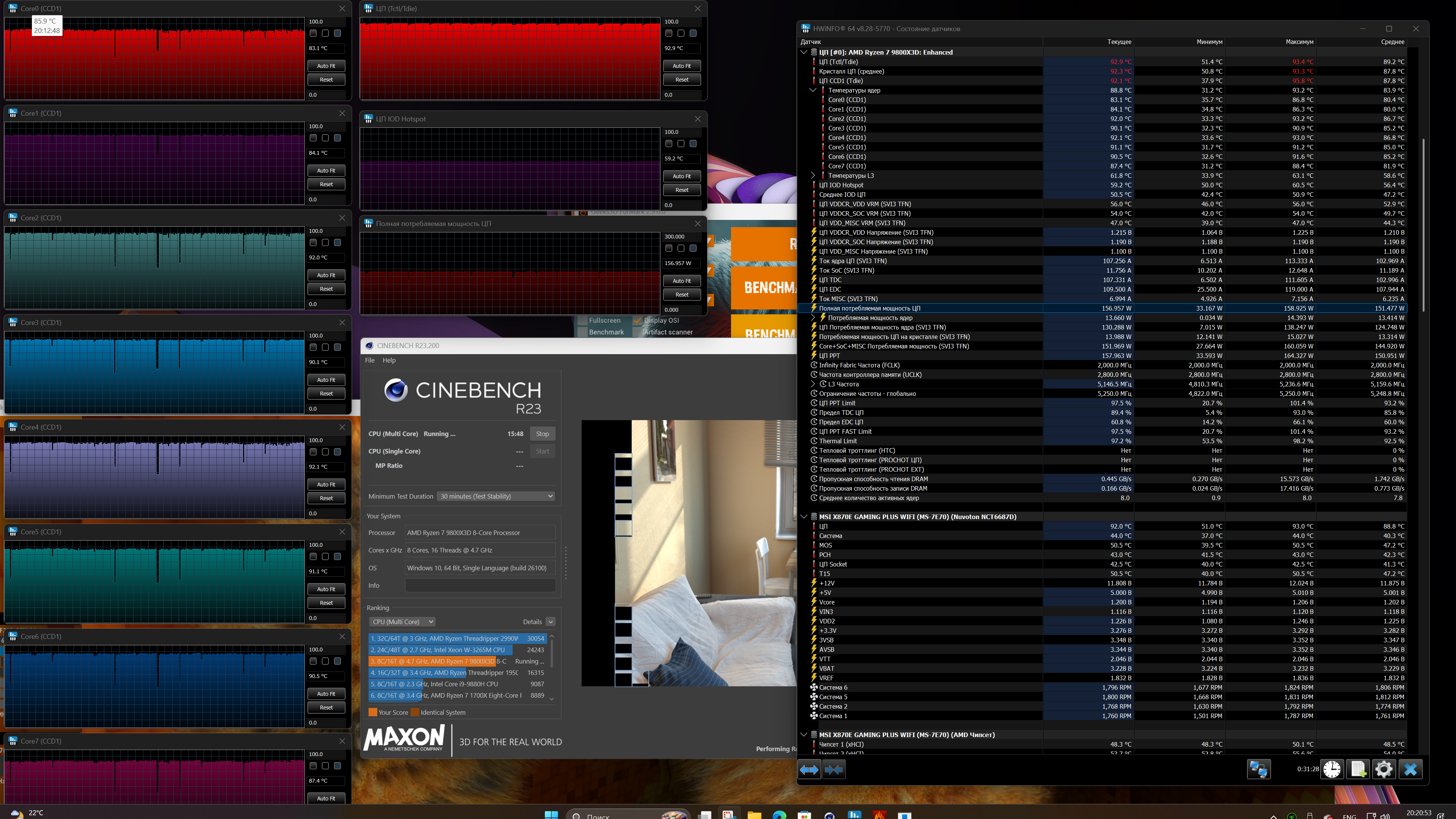 Собственно, зазубрины на графике потребляемой мощности совпадают с каждым новым циклом формирования картинки в Cinebench. Так что, это видимо не троттлинг. И процессор может и ещё горячее быть? На 95 градусах у него вроде троттлинг? Нормальны ли такие температуры для данного камня, или быть может я где-то накосячил с нанесением термопасты, или быть может эта система охлаждения слабовата для 9800x3D или быть может какие-то дополнительные сведения нужны? Или тесты какие-то ещё провести? Буду признателен за любые подсказки. В первую очередь хочу убедиться в том, нанёс ли я корректно термопасту поставил ли правильно кулер. А то совсем страшные каике-то температуры. И ведь щас до конца соберу, а потом опять разбирать не хотелось бы.