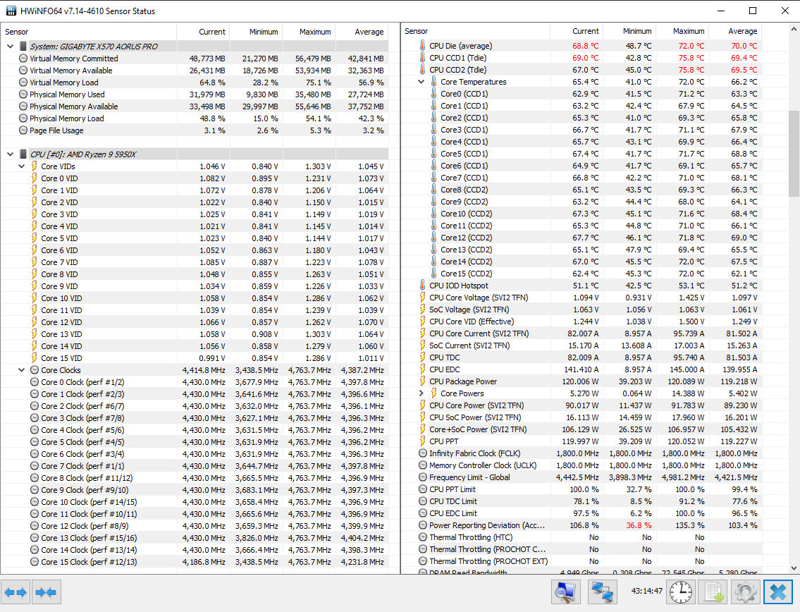 Не, паренек, не путай тяжелое с мягким. Средние значения - это одно, а текущие (фактические) - это совсем другое. Приведи скрин, чтобы в PBO+CO было текущее значение 1,0...1,05v и Core Effective Clocks=4,4 ГГц на 5950Х. С нетерпением жду