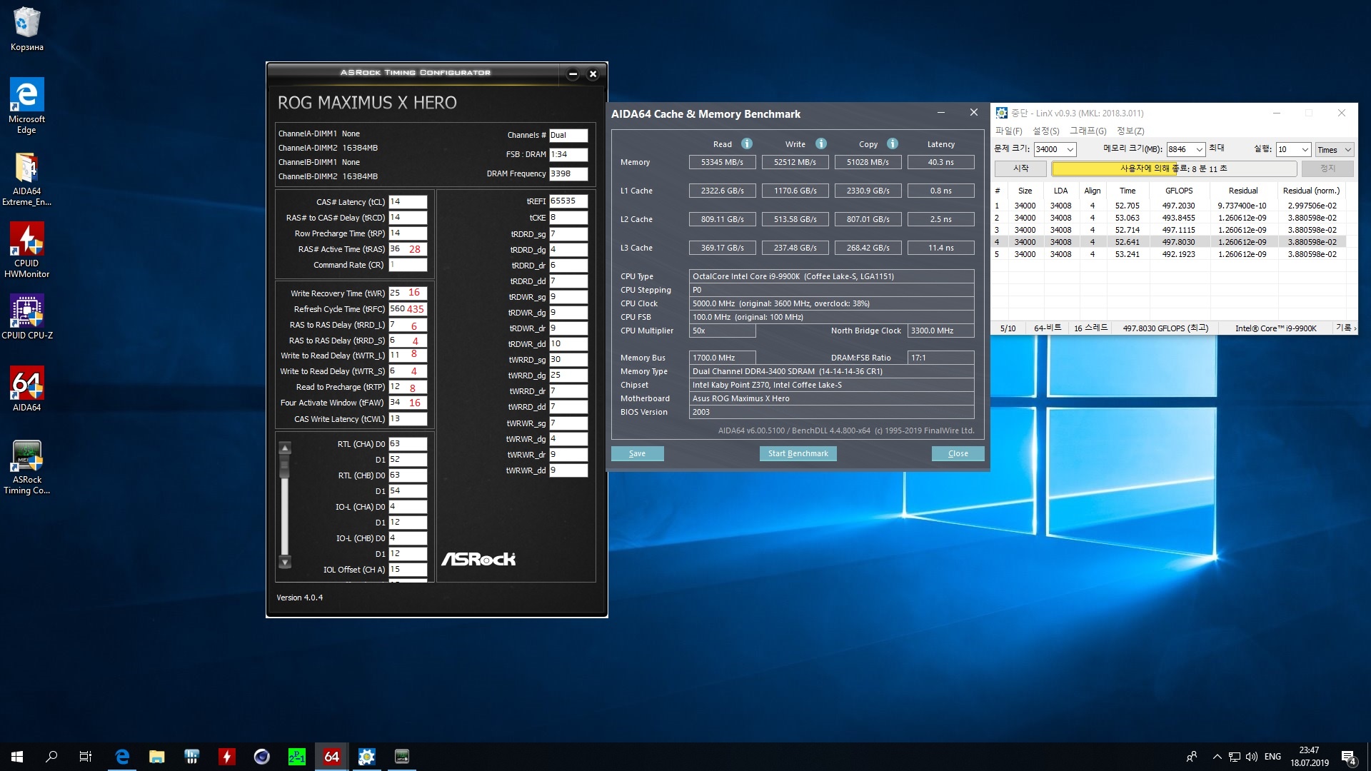 Полученный результат должен иметь следующий вид: Скриншот рабочего стола после прохождения >9 циклов (т.е. между 9 и 10 проходами). Вместе с LinX на рабочем столе должны быть развернуты CPU-Z (первая вкладка) и Core Temp, это обязательный минимум. Такой набор программ даст информацию о напряжении и температурах под нагрузкой-простоем. По желанию можете добавить другие программы, показывающие дополнительную информацию о вашей системе, например третью вкладку CPU-Z, которая покажет модель материнской платы и версию BIOS. Пример результата разгона: Mad Max, 5100 МГц (AVX 0), i7-8086K, HT-ON, Cache 4700, Vcore=1.36V, Batch L805E123, Gigabyte Z370 Aorus Gaming 7 (bios F6), Be Quiet! Dark Rock Pro 4, ЖМ под HS, Windows 10 Pro 64-bit 1809, LinX 0.9.3 64bit.
