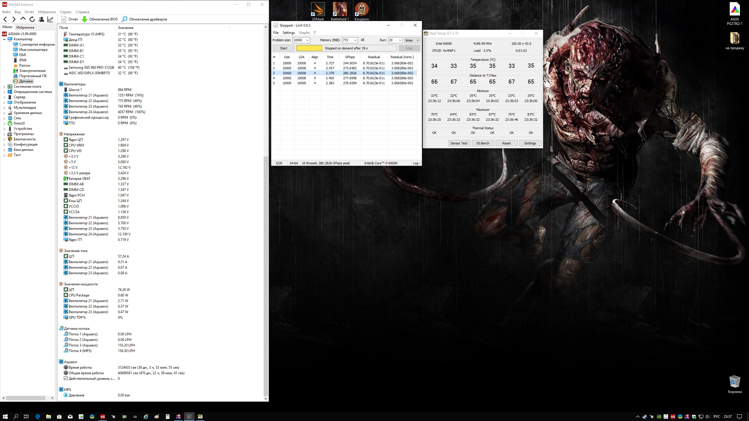 Выставление V core на 1.25 вольта приводит к LinX к температурам в 90 градусов по ядрам и потреблению в 290W