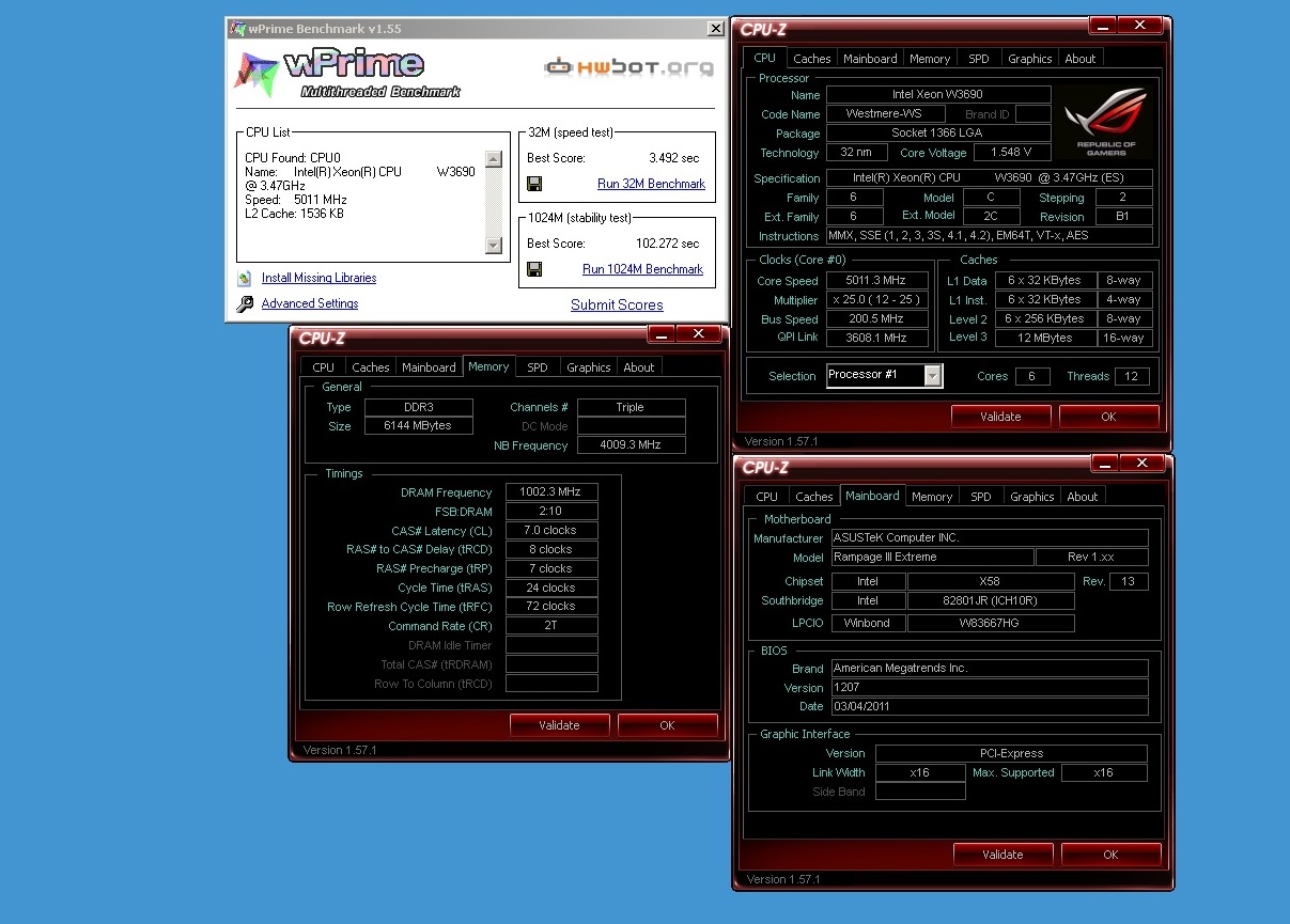 wprime, так же неплохой многопоточный процессорный бэнчмарк, серьезно нагружает CPU и оперативную память, особенно длинный тест 1024М перед запуском необходимо выставить в настройках бэнчмарка количество потоков например 6,8,12,24. http://www.wprime.net/ вот мой скрин с результатами Core i7 990X 5Ghz http://img.maryno.net/images/6e8e1e75bf ... 0a6d3.jpeg