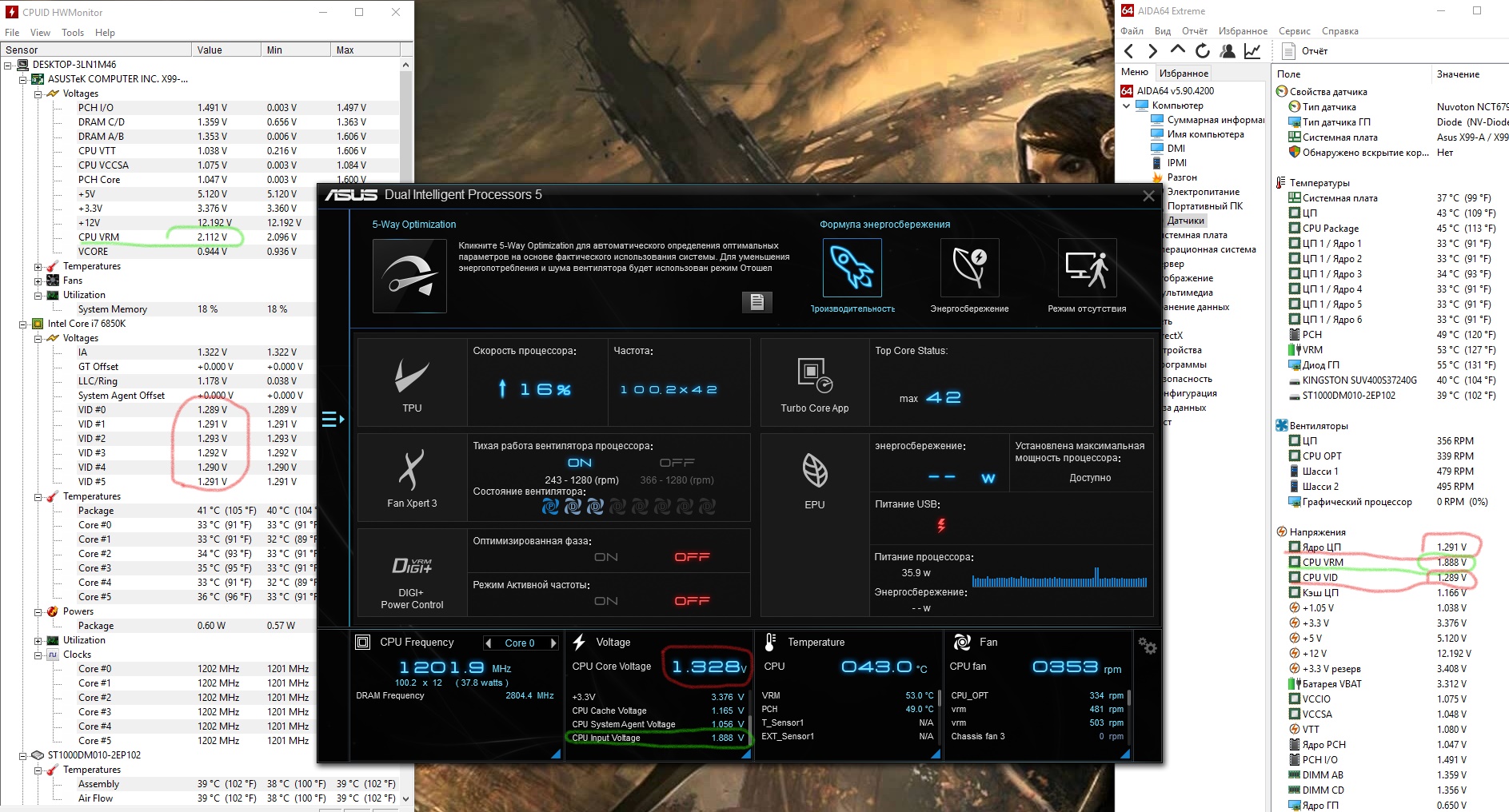 leovoron79 а CPU-Z что показывает? Если то же,что и HWMonitor и AIDA, то вывод очевиден. CPU-Z уже лет 20 существует, и её показания сравнивали с мультиметром, разхождения были минимальными. А эти асусовские поделки😢