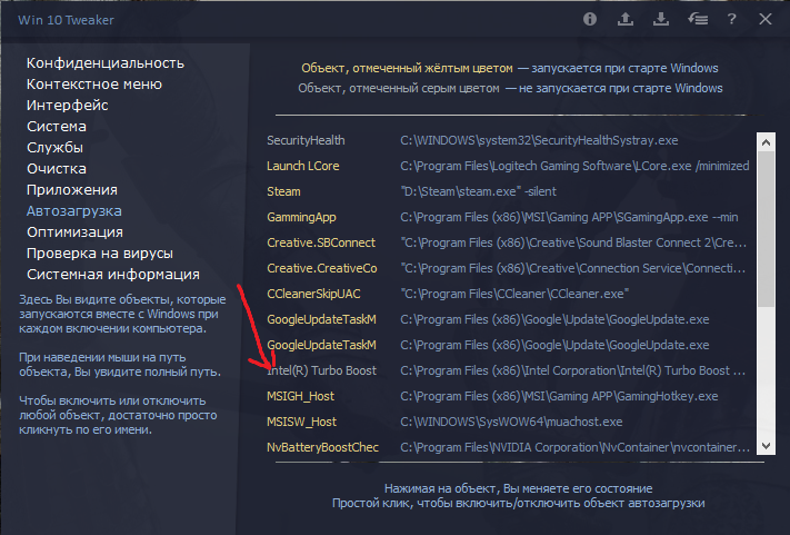 Какой фигни? Я тебе написал как отключить открытия окна драйвера интел турбо буст 3.0 при запуске ос. Скачиваешь win10 tweaker, в нем закрываешь запуск в фоне драйвера интел турбо буст 3.0, потом если утилита win10 tweaker не нужна, удаляешь ее, инсталяции она не требует.Профит.