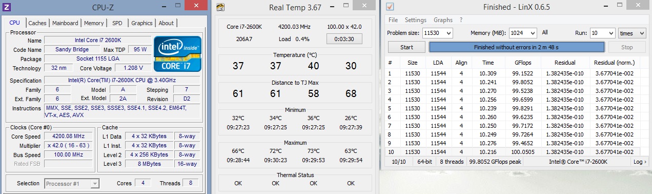 В общем фигня какая то, я вчера, разогнав, засомневался в показаниях цпу-з, сегодня сбросил в дефолт, запустил значит три проги - ОССТ линпак, снова цпу-з(глючный?), ну и реал темп. Скрин вот, всё как то плохо, и не понятно кто врёт, аида64 или цпу-з, думаю показания аиды адекватней.