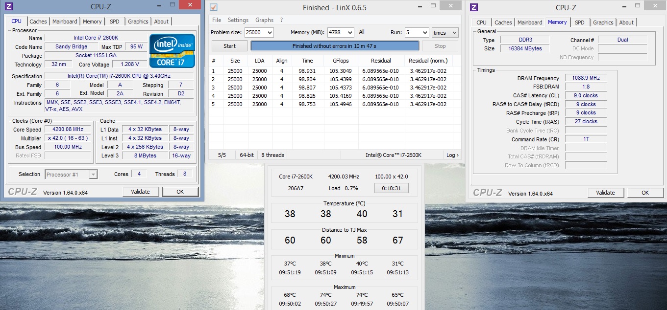 Спасибо, проц разогнал до 4,2ггц, без поднятия напруги, турбобуст отключил, енергосберегайки выключил, цпу еист включил, память так и оставил на частоте 1866мгц, осст прогнал, линх прогнал, последний, кстати, погорячее, на 4,2 самое горячее ядро оказалось 65 градусов за 10 проходов, получилось 93 помоему гигафлопса, вобщем работает пока, и в играх работает. Благодарю. И да, как по мне, 70 градусов как то некомфортно, потому наверное 4,5 брать не буду, да и видео слабоватое.