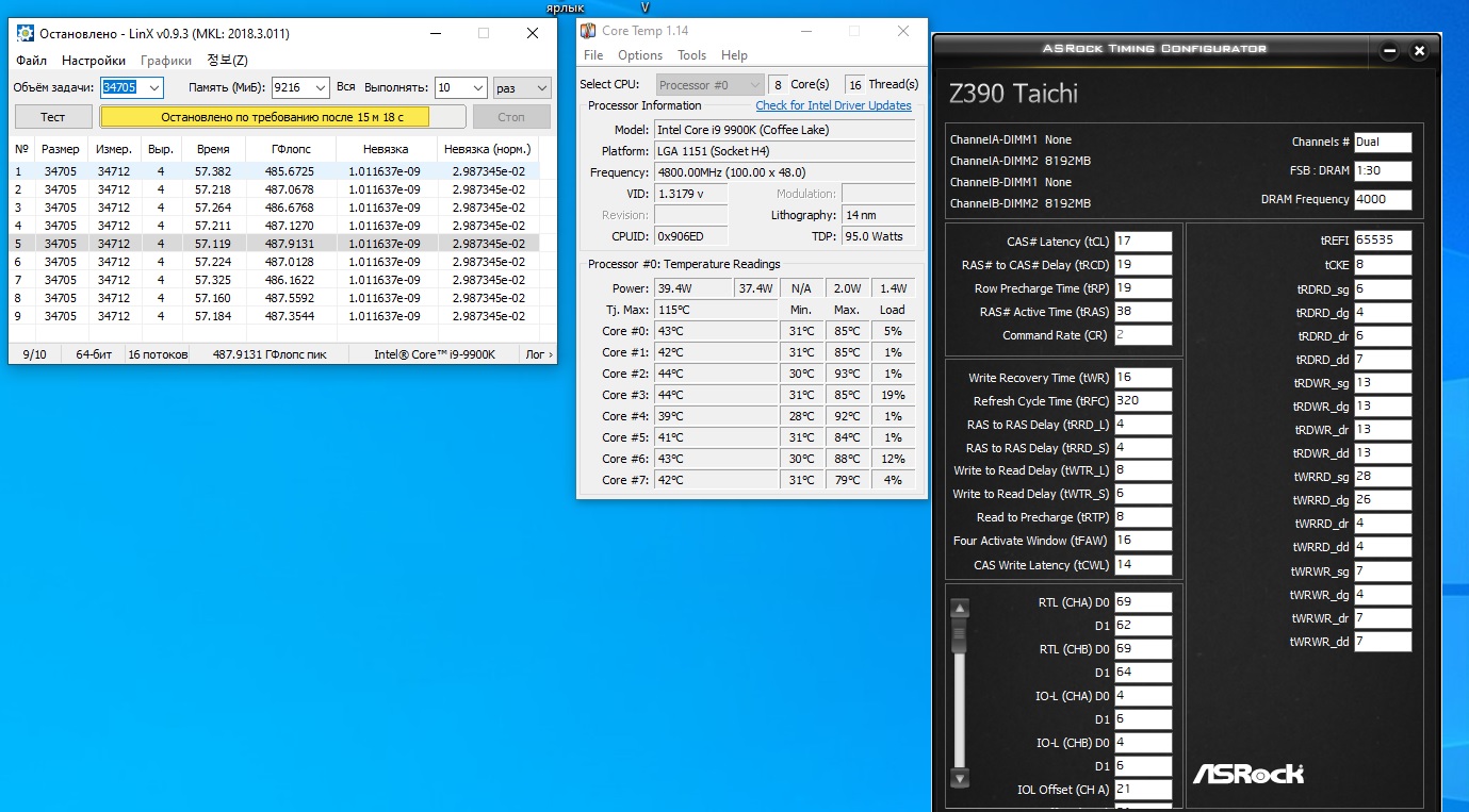 Полученный результат должен иметь следующий вид: Скриншот рабочего стола после прохождения >9 циклов (т.е. между 9 и 10 проходами). Вместе с LinX на рабочем столе должны быть развернуты CPU-Z (первая вкладка) и Core Temp, это обязательный минимум. Такой набор программ даст информацию о напряжении и температурах под нагрузкой-простоем. По желанию можете добавить другие программы, показывающие дополнительную информацию о вашей системе, например третью вкладку CPU-Z, которая покажет модель материнской платы и версию BIOS. Пример результата разгона: Mad Max, 5100 МГц (AVX 0), i7-8086K, HT-ON, Cache 4700, Vcore=1.36V, Batch L805E123, Gigabyte Z370 Aorus Gaming 7 (bios F6), Be Quiet! Dark Rock Pro 4, ЖМ под HS, Windows 10 Pro 64-bit 1809, LinX 0.9.3 64bit.