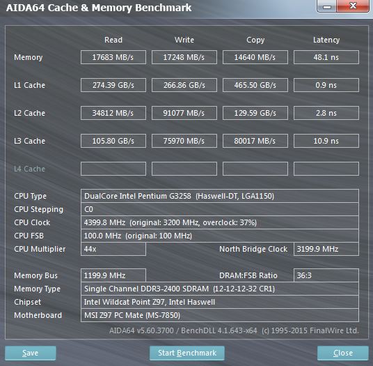 В теории один канал DDR3 2400Mhz даёт 19200MB/s. На практике даже одноканал не дает теоретического максимума . (в случае с пентиум хасвел, рингбас-кэш в стоке) ситуация такая: