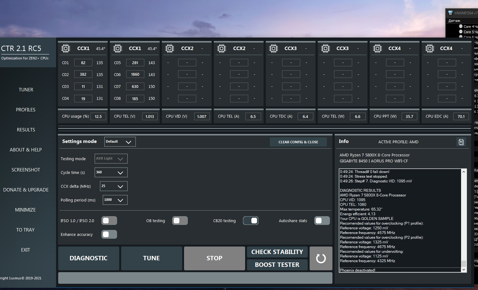 привет. гоняю свежекупленный r7 5800х вот запустил ctr2.1 но так как охлад говно (корпус то sfx), я отключил автобуст (не влияет на результат crt) и smt... в общем 8 ядер... + я погнал if до 3800mhz 1:1 под память (хотя у памяти выше 4000mhz предел) по итогу диагностики говорит golden sample - можно ли верить, учитывая что тест был не в стоке?
