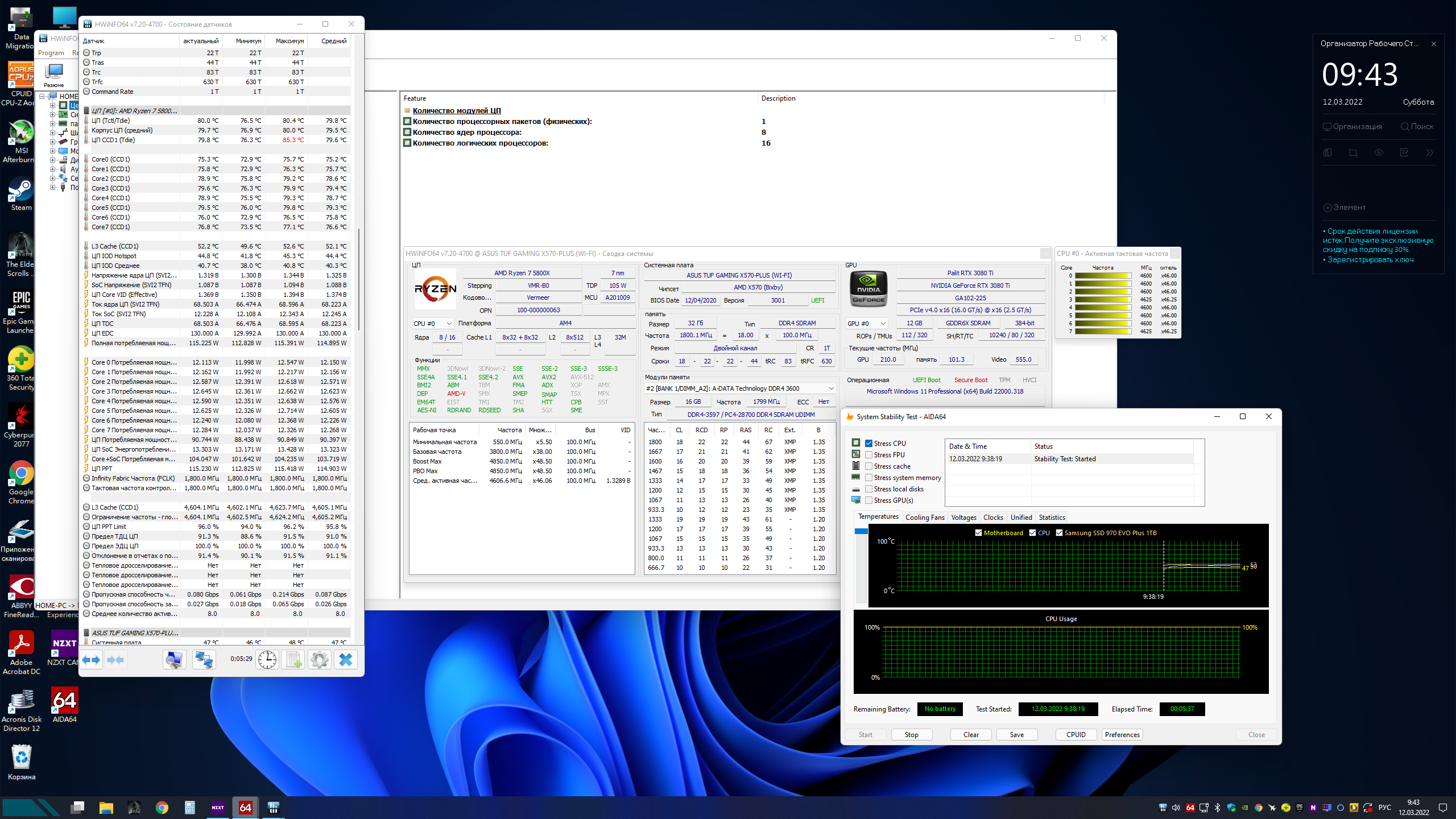 Всем доброго вечера! Прошу не пинать новичка. На фоне кризиса решил воплотить мечты мальчика о топовом компе. Мальчику 34 скоро стукнет, но не суть. Конфиг: Asus X570 Tuf gaming + Wi-Fi Ryzen 5800x be quiet! DARK ROCK PRO 4 Palit 3080 Ti gamerock A-Data XPG Spectrix D60G RGB 3600 32 gb Samsung 970 EVO Plus 1Tb Cooler Master V850 V2 Gold 850W be quiet! PURE BASE 500 DX WHITE (+3 доп кулера, всего 3 на выдув и 3 на вдув) Успешно приобретено и собрано собственноручно, впервые за все время после сборки все завелось с полтыка. Но есть проблема, а может и нет. Короче, беспокоит температура. Скачал Киберпанк, выкрутил всё на максимум лучи+длсс 4к 60гц. Температура после разных настроек в биосе и афтебернинге в лучшем случае была - ГПУ 75, ЦПУ 85. ФПС скачет вокруг 60. Вопрос, как мне охладить машину? Или плюнуть пусть топит? Есть ли какие то универсальные способы? В теме настроек напряжения, лимитов и прочая совсем недавно. Вертел крутил, пар раз биос сбрасывал, один раз батарейку снимал. Каких то верхов нахватал, но пока не много. Подскажите люди добрые как охладить печку. До этого были не такие высокопроизводительные системы и, собственно, таких проблем не было. Заранее спасибо.
