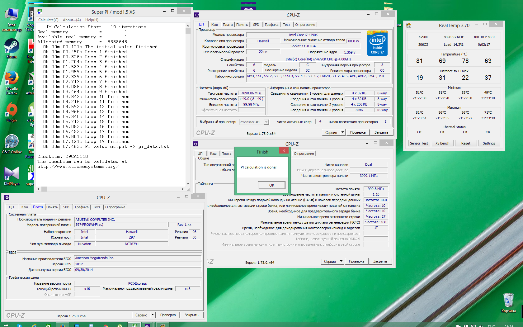 Узнал, как сделать турбо-буст агрессивный на матери Asus. Достаточно сделать CPU CORE 44 на всех ядрах. При этом Asus Overclock Tuner в мануал не надо переводить. Так вот со стандартным бустом на моем проце при частоте 4200 напряжение было 1,133V. А сейчас агрессивный турбо-буст на всех ядрах 4400 так вот напряжение стало 1,221V Не слишком ли сильно мать задрала ? Из-за 200мгц А если самому разгонять через оверклок мануал, то проц напряжение в простое не будет сбрасывать, а только частоту. А так он и частоту и напругу сбрасывает в разгоне. Вот поэтому и сделал агрессивный турбо-буст 4790K