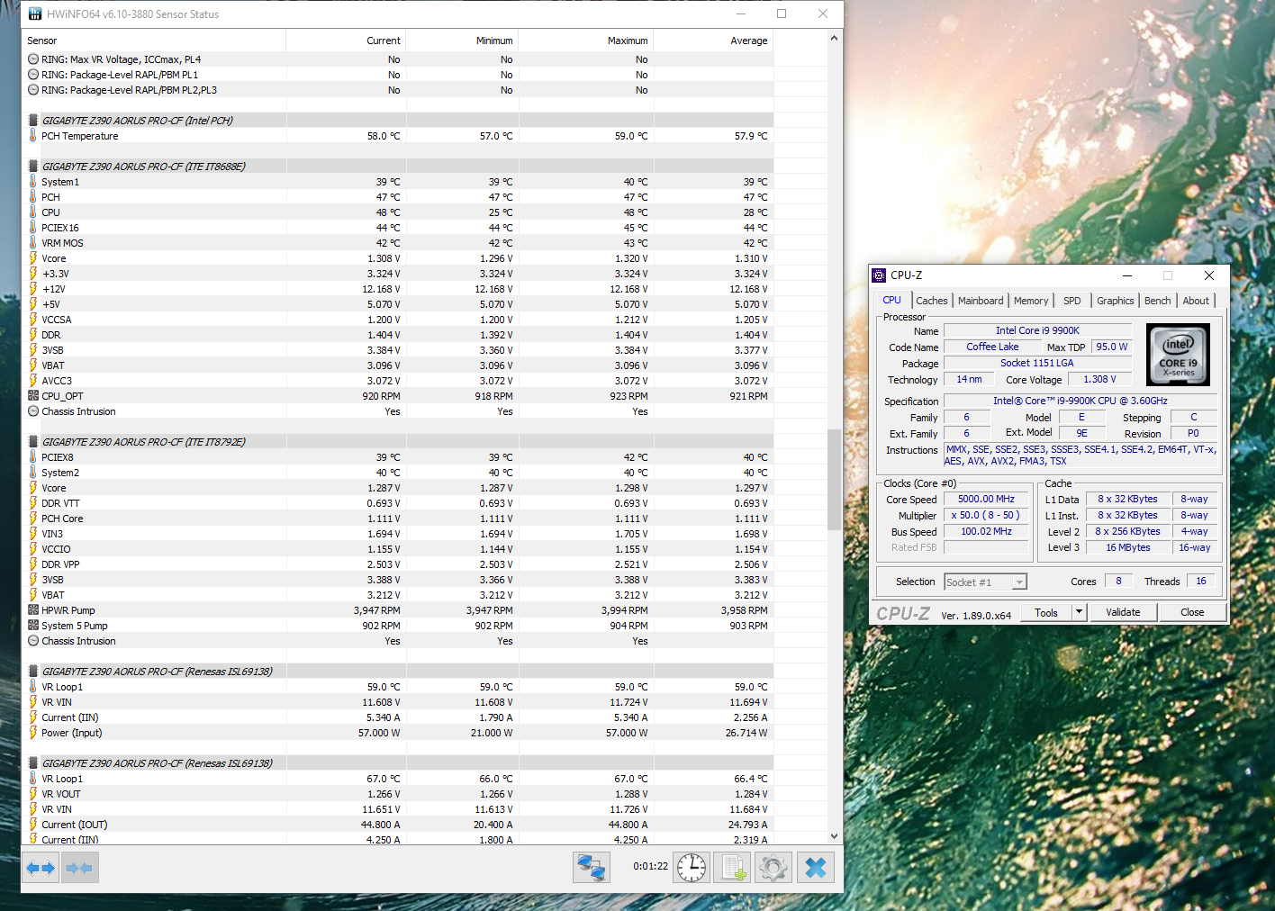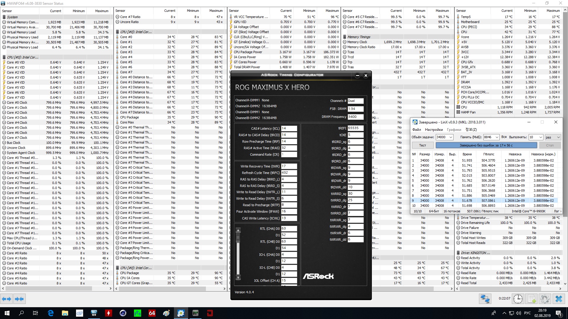 Полученный результат должен иметь следующий вид: Скриншот рабочего стола после прохождения >9 циклов (т.е. между 9 и 10 проходами). Вместе с LinX на рабочем столе должны быть развернуты CPU-Z (первая вкладка) и Core Temp, это обязательный минимум. Такой набор программ даст информацию о напряжении и температурах под нагрузкой-простоем. По желанию можете добавить другие программы, показывающие дополнительную информацию о вашей системе, например третью вкладку CPU-Z, которая покажет модель материнской платы и версию BIOS. Пример результата разгона: Mad Max, 5100 МГц (AVX 0), i7-8086K, HT-ON, Cache 4700, Vcore=1.36V, Batch L805E123, Gigabyte Z370 Aorus Gaming 7 (bios F6), Be Quiet! Dark Rock Pro 4, ЖМ под HS, Windows 10 Pro 64-bit 1809, LinX 0.9.3 64bit.
