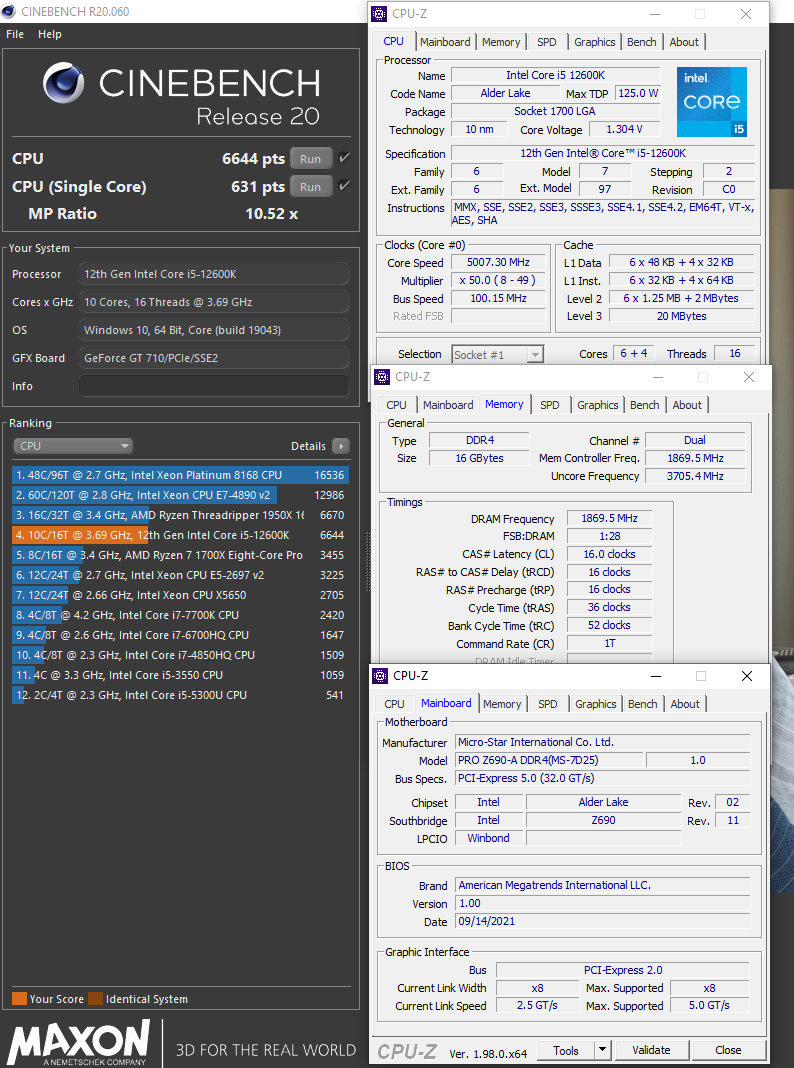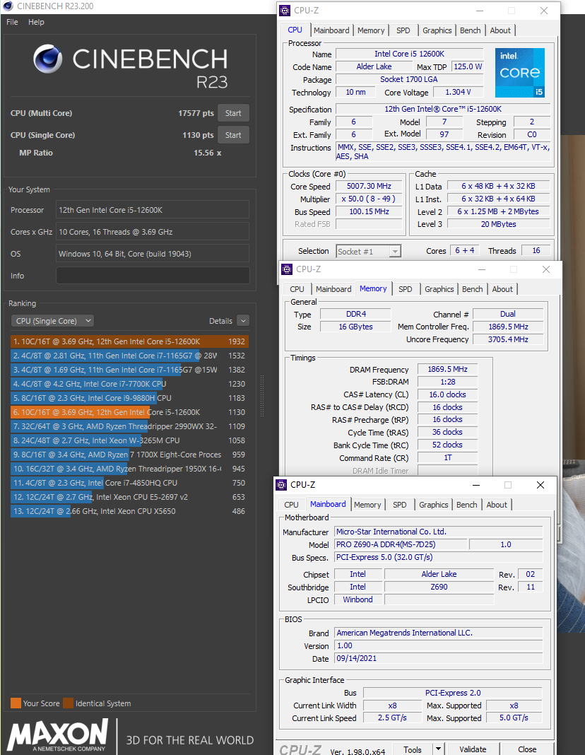 Core i5-12600K + MSI Pro Z690-A DDR4 (bios 1.00) + Windows 10. P-Cores - 5000 E-Cores - 3700 Ring - 3700 Gear 1 DRAM 133 DDR4-3700 16-16-16-36-52-1T (ещё в процессе прощупывания разгонного потенциала).