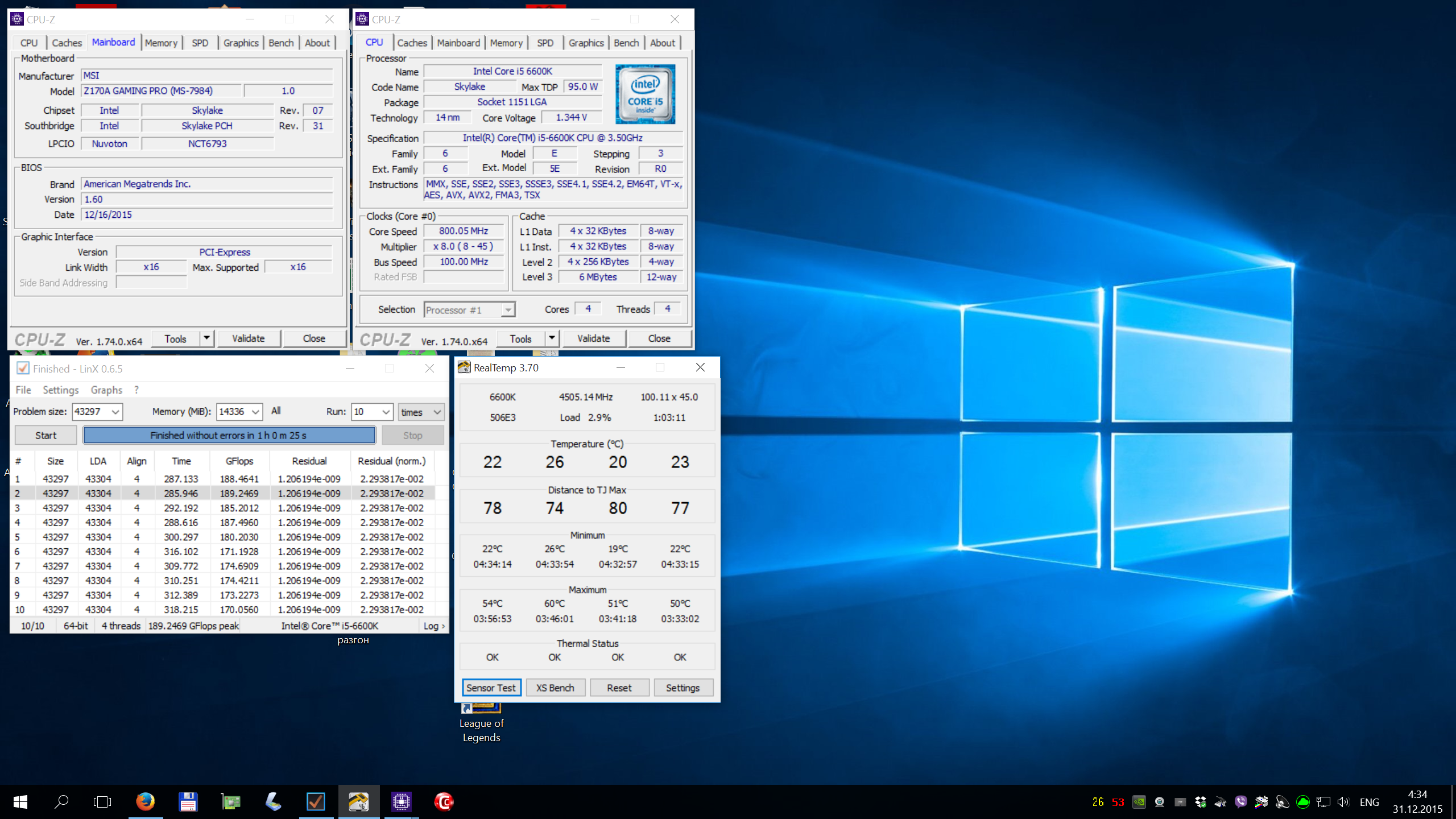 Sadaharu, 4500МГц, i5-6600K, Vcore=1.34V, VID=1.179V, coollaboratory liquid pro под HS, Zalman CNPS10X PERFORMA/+, MSI Z170A Gaming Pro BIOS 1.6, Win 10 x64, LinX 0.6.5 64bit