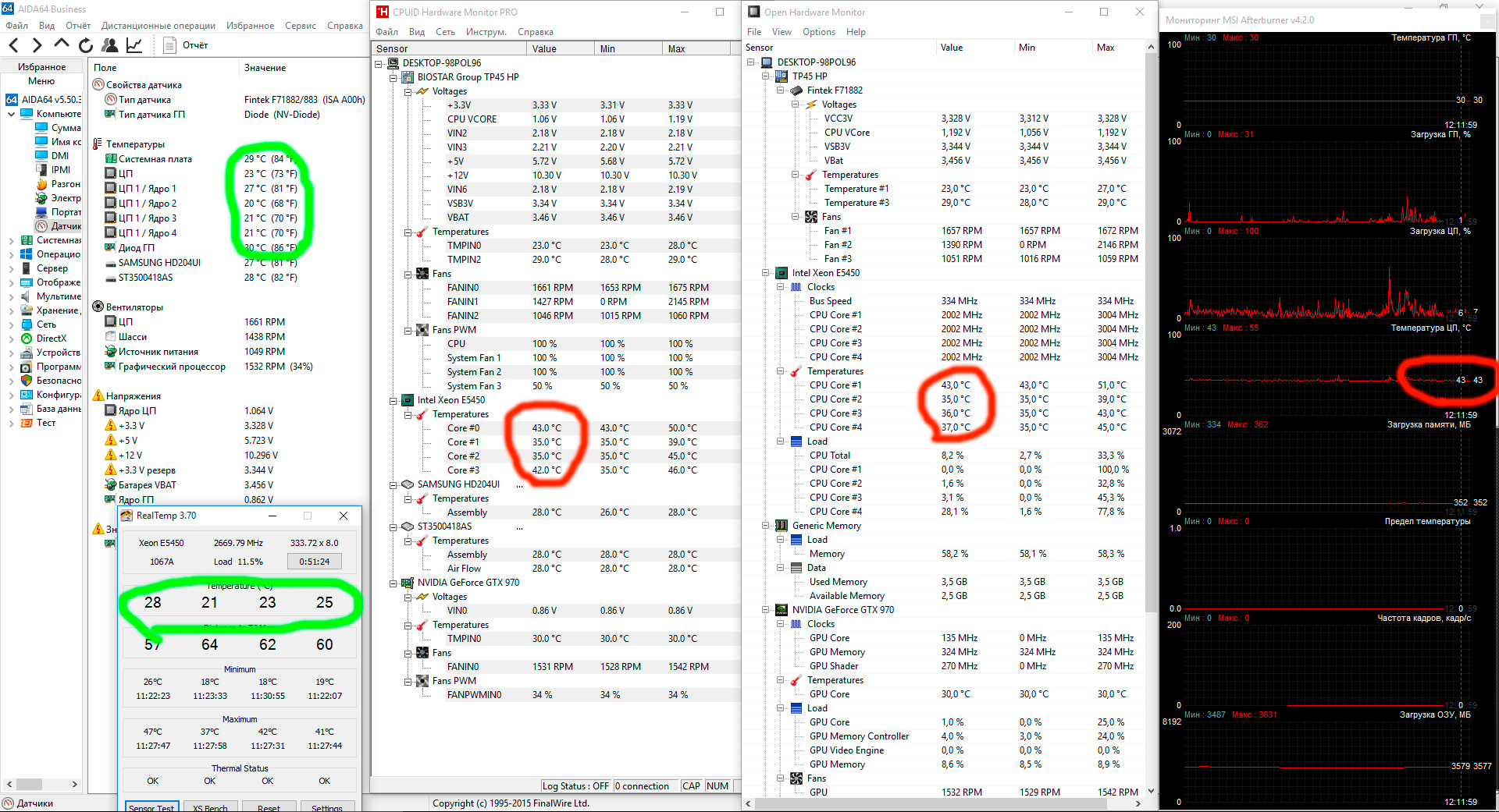 И все же, каким показаниям верить мониторинг в MSi врет??? 43/23 ??? На проце вертится gammaxx300 Проц легко берет 400*9=3600, собираюсь выше идти, а вот какой температуре верить что бы контролировать процесс...