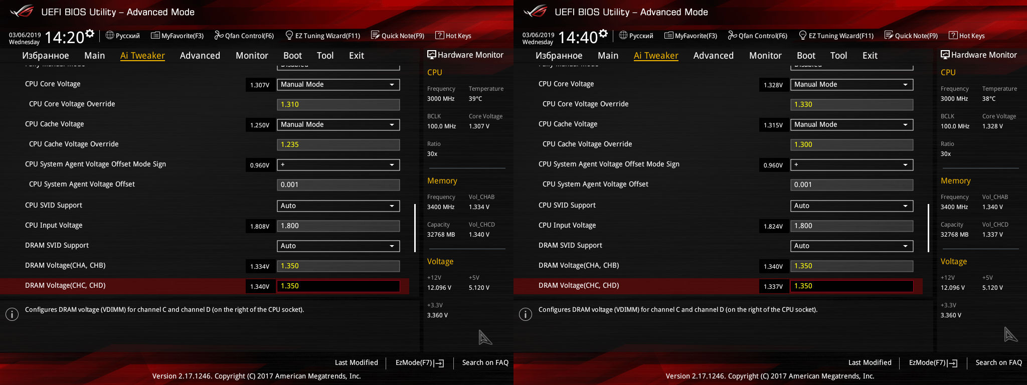Считать оффсет. режим очень просто, тут простая арифметика т.е. сложение и вычитание. Например, у меня для 3.7Ггц( на скрине левое изображение а на правом 3.8Ггц) напряжение требует 1.235v а стоковое 1.0v и для этого в оффсет. режиме в значении + прибавляем 0.235v. Перезагружаем и получаем 1.235v, но мать в оффсет. режиме практически всегда занижает напругу где то на одну сотую и чтобы получить 1.235v надо прибавлять 0.245v а то и больше. С одной стороны это хорошо, в винде напруга падает а с другой при нагрузке она прыгает то выше то ниже и могут быть бсоды и приходится напряжение корректировать. И по этому лучше зафиксировать в ручном режиме, где напряжение будет стабильным. Но тут пользователь решает сам как ему лучше. По вопросу, до скольки можно безвредно повышать кэш по напруге? Безвредность понятие относительное, сколько напруга и охлад позволяет настолько можно и повышать частоту кэша. Ну примерно так, чем лучше охлад тем меньше напряжения требуется для определённой частоты. Но тут не всё так просто, напряжение кэша и его частота зависят от частоты процессора и опер.памяти. Тут надо искать золотую середину между частотой процессора, кэша или памяти. Что более требуется на то и наваливать а что отпускать. P.s. эти профили в основном для бенчмарков, в повседневных задачах я ими не пользуюсь, производительности хватает т.е. это просто демонстрация разгона железа.