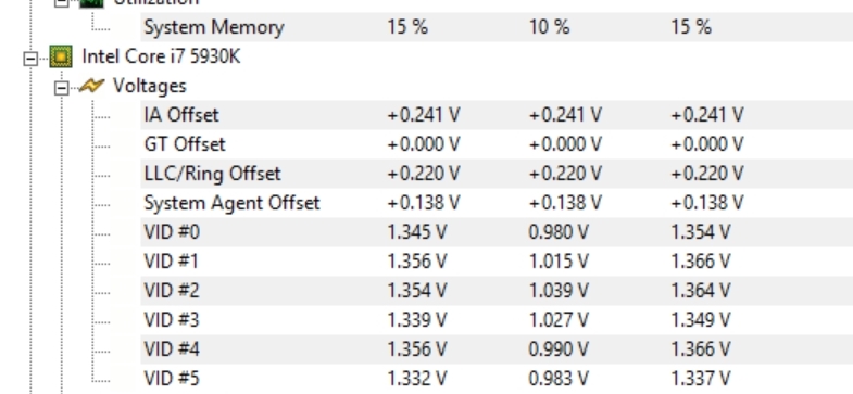 Может ли HWMonitor так врать или стоит бояться? https://ibb.co/svxk1KM - колонка max, значения какие-то неадекватные после часа игры, пока hwmonitor висел в фоне. Сейчас прогоняю уже 2 часа в прайм, такой бяки нет. Все как положено: vcore при 3.8ггц - 1.1v, кэш при 3.4ггц - 1.02v. Одного показателя IA offset в значении 1.3v уже достаточно, чтобы нервно дергать глазом.