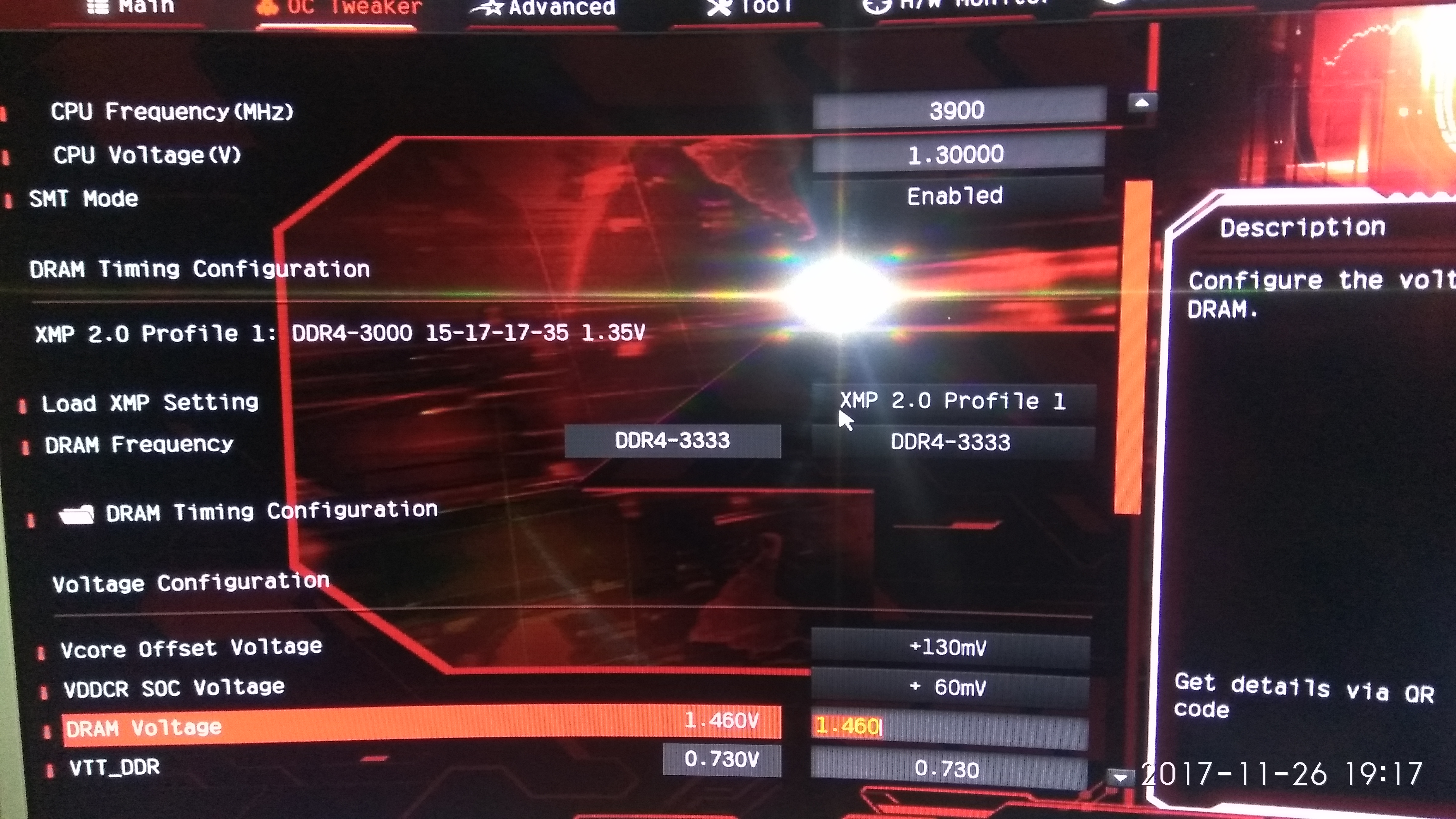 Теперь понятно, смотрим CPU Voltage в биос стоит 1.300 в HWInfo это Core VID VCore offset +0.130 это идет плюсом к твоим CPU Voltage =1,43, а в HWInfo это CPU Core Voltage строка (по цифрам получается чуть ниже по мониторингу) SOC offset стоит +0,060 это идет плюсом к SOC , который рассчитан платой из DRAM Voltage, SOC у тебя скорее всего 1.087 как и у меня и +0,060 получается 1,144 а пишут, что максимум надо в пределах 1.1 стараться держать. Если 3333 не берется ниже, может имеет смысл 3200 оставить? Вот мой скрин для сравнения
