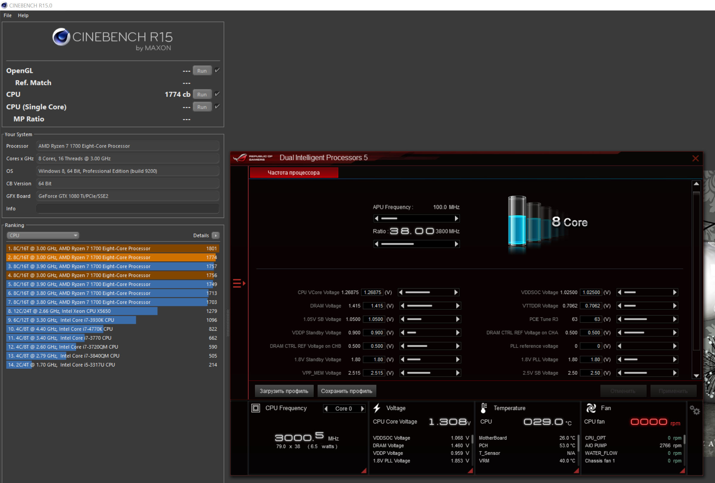 - Обычно поставляется в коробке с системой охлаждения Wraith Spire RGB (это круглая конструкция из целого куска алюминия с медной вставкой-испарительной камерой в основании и вентилятором с кольцом разноцветной подсветки, крепится к задней пластине разъёма AM4 четырьмя винтами). - Штатно имеет базовую частоту 3.0ГГц, частоту 3.2ГГц (технология Turbo Boost) при обычной многопоточной нагрузке (Blender n-cores render) и 3.75ГГц (технологии Precision Boost и XFR) при однопоточной нагрузке (Cinebench R15 single core). - Штатное напряжение питания 1.1875В. Может возрастать до 1.3В на отдельных ядрах во время работы Precision Boost и XFR. - Очень энергоэффективный, требования к СО (TDP) - всего 65W. Энергопотребление порядка 10Вт в простое и 85Вт в обычной многопоточной нагрузке (Blender n-cores render).
