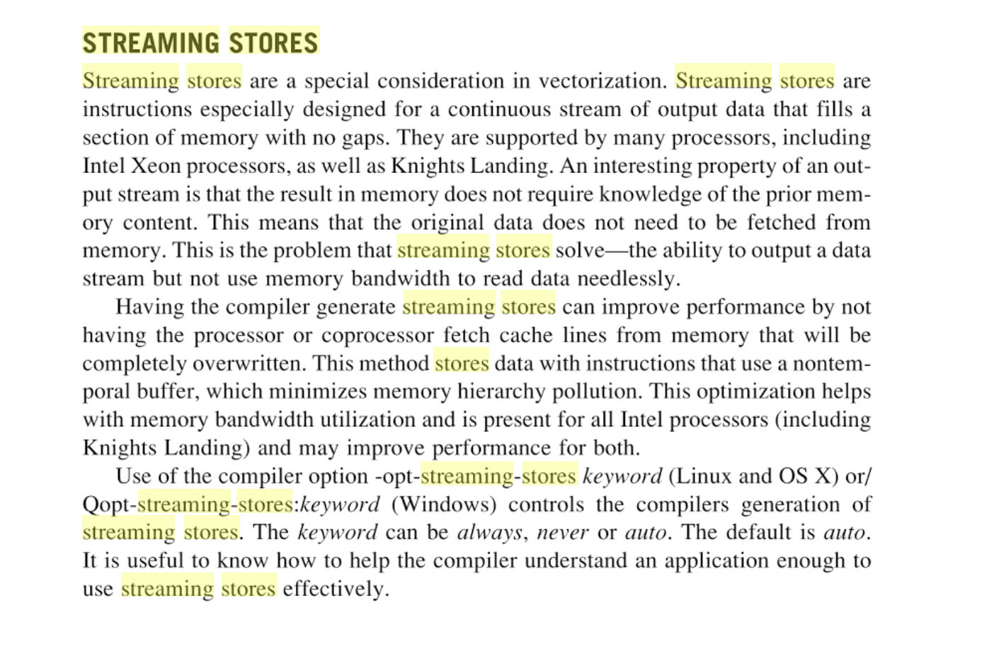 Streaming load / streaming store - это загрузка/выгрузка данных в обход кэшей. Используется для данных, которые будут использованы всего один раз, и хранение которых в кэшах не требуется, дабы не засирать последние.