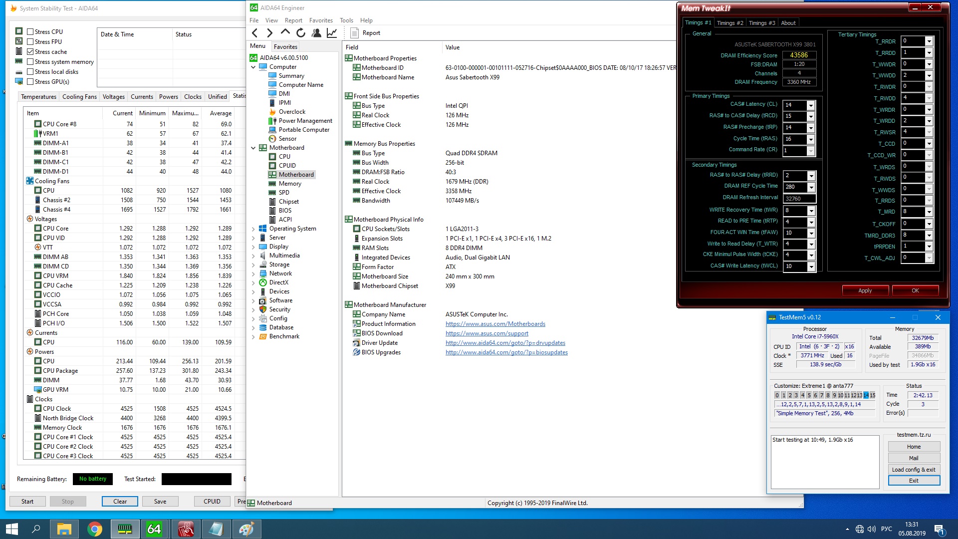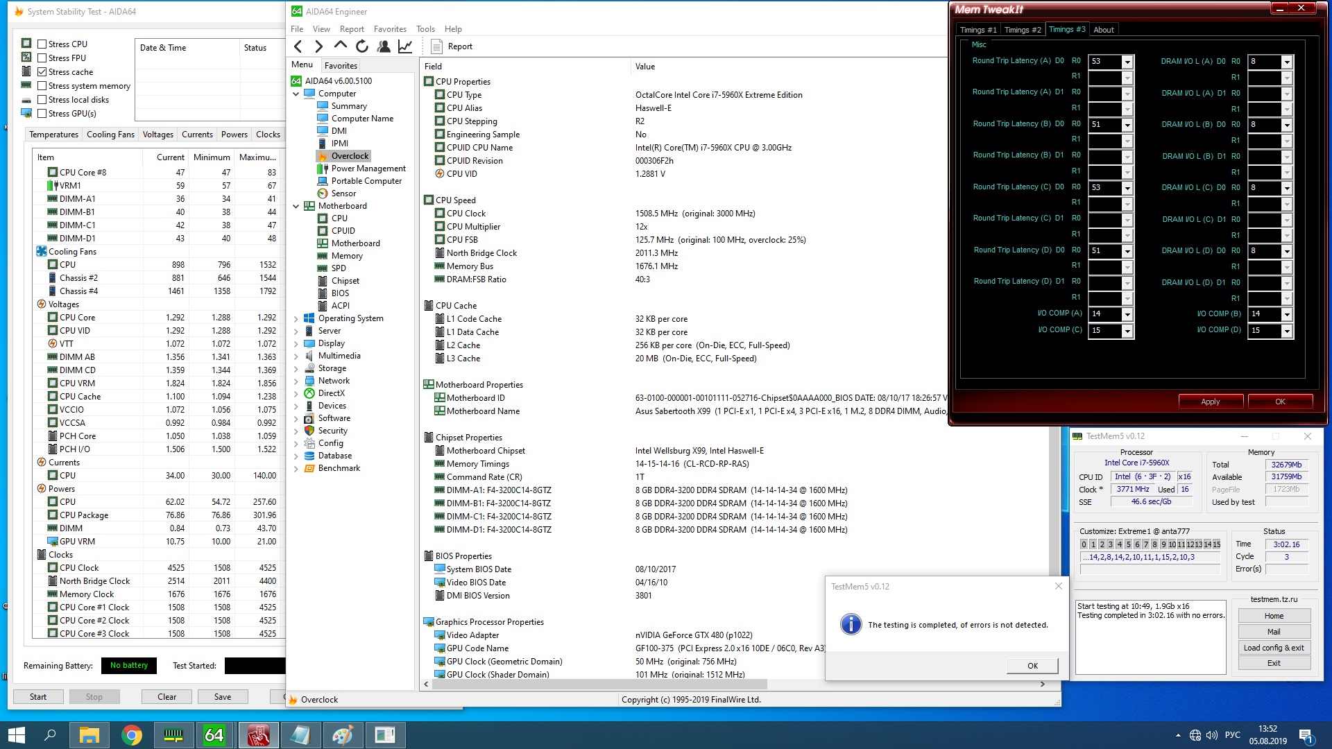 как бы не выглядели не по фэншую тайминги by Kolizeum(ака бредово по некоторым позициям DRAM RAS#to RAS который должён быть не меньше сумме первых 2 первичных таймингов и непонятной DRAM Write Latency = 11) но встретив такие чудеса не в первый раз, например ещё тут https://youtu.be/ERUzTot2hiA я крепко призадумался, как такое может работать(там я списал такие чудеса на старый биос) при таких DRAM WRITE REcovery Time, DRAM READ to PRE Time, DRAM FOUR ACT WIN Time(он в минимуме=DRAM RAS#to RAS Delay х4), то почему бы и не попробовать, тем более есть память а ля Kolizeum. вообщем завёл весь этот "бред" на 5960х@4.5/4.4@3354 ток чутка доработал по своему видению и затестил TM5 c конфигом Extremе by anta777 как ни странно без ошибок детализация тут => https://yadi.sk/d/SxfdieRSEmUIXA кого она не волнует