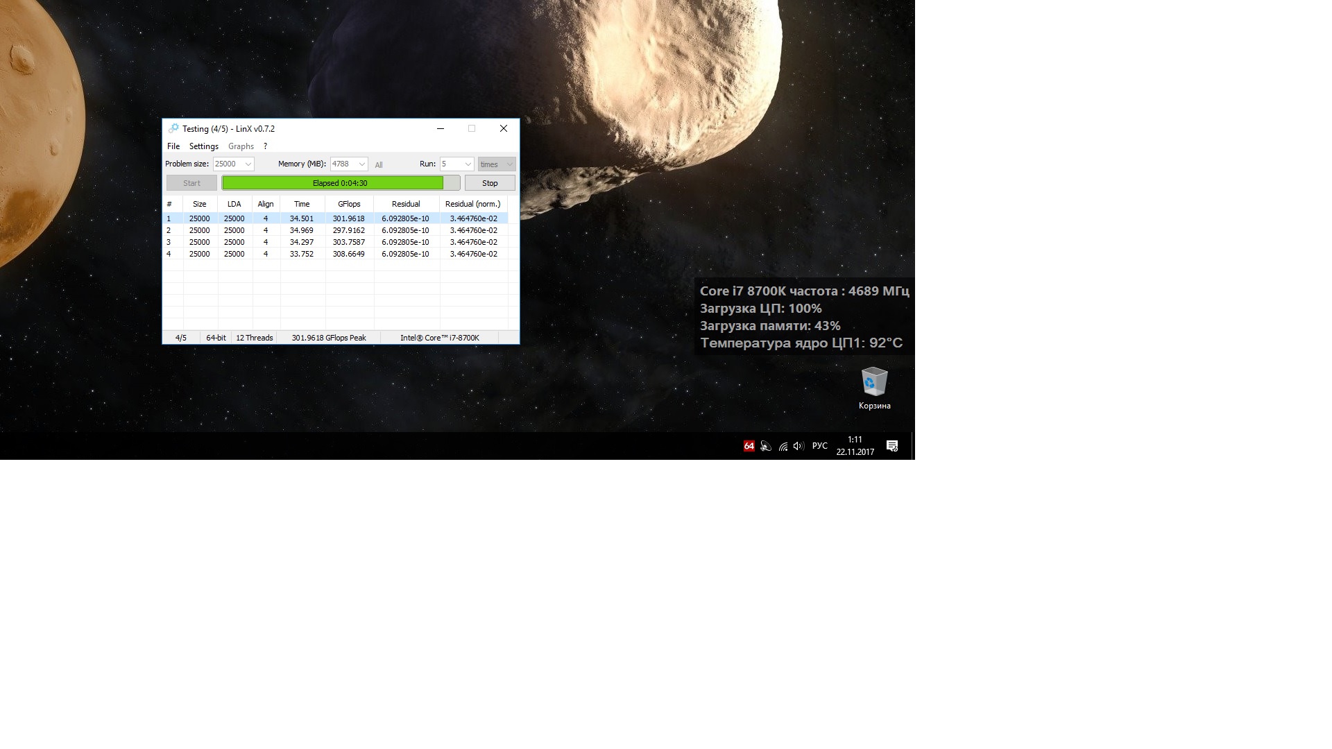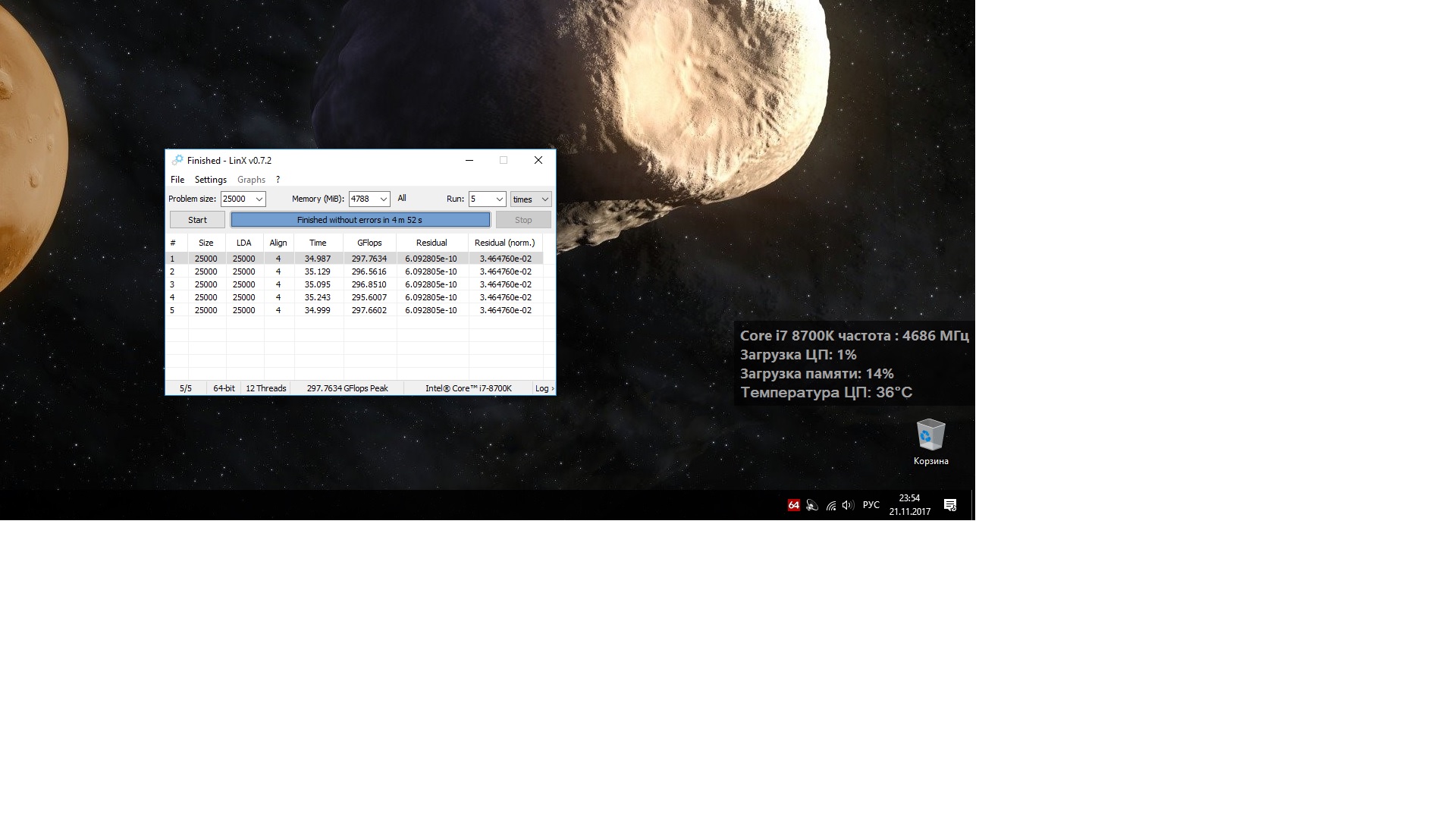 LinX должен быть настроен следующим образом: Задаете режим 32 либо 64 бит, объем задачи = 25000 (не меньше 25000), количество проходов = 10 (не меньше 10).