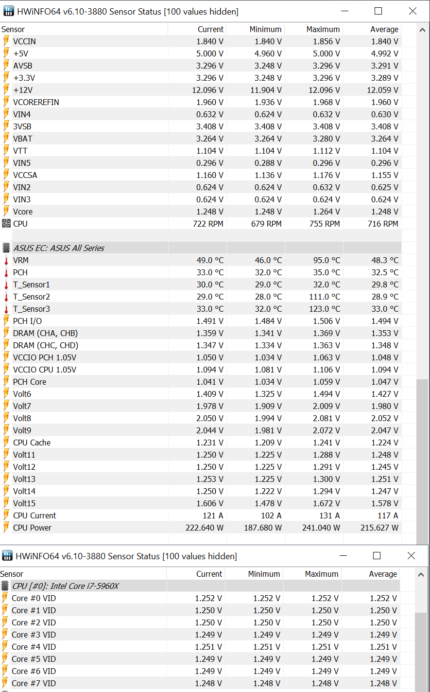 Материнку я эту брал по тому же принципу как взял 6950X когда была цена относительно не большая , на материнку цена тоже была не большая и составляла 15К. я Читал что многие жаловались на то что и на ней и на стриксе процы сгорели , однако у меня всё живёт и живее всех живых. А вот что за рандомка в значениях T_Sensor 2/3 я тоже понять не могу ,у меня там минусовые значения. VRM в HWInfo я не смотрел , но как видели на скринах где я гонял линпак по 7-8 часов он выше 65-и вообще никогда не поднимался. Кстати большинство людей которые где либо писали что процессоры сгорели , писали это на X99-A / X99-AII / Strix в общем на начальном уровне ) ну или людям с дорогими матерями просто не комильфо признавать такие же факты.