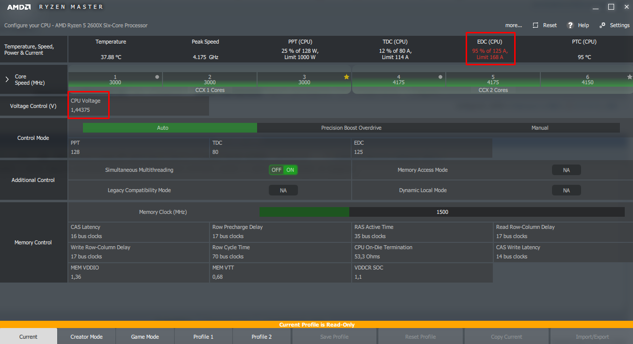 В общем, ради интереса установил Ryzen Master, и сразу обратил внимание на то, что напряжение постоянно скачет (даже в простое), и периодически приближается к предельно допустимым 1.45v (разгоном не балуюсь, если что). При этом, в BIOS вольтаж выставлен стандартный: 1.35. Помимо этого, показатель EDC (CPU) держится в районе 90-95%. В одной из нагугленных статей рекомендовали сменить схему питания с "AMD Ryzen Balanced", на обычную "сбалансированную". Так и сделал, и EDC значительно снизился (до 60-90%), но вот напряжение по прежнему периодически скачет высоко даже в простое. Скажите, это нормально вообще?