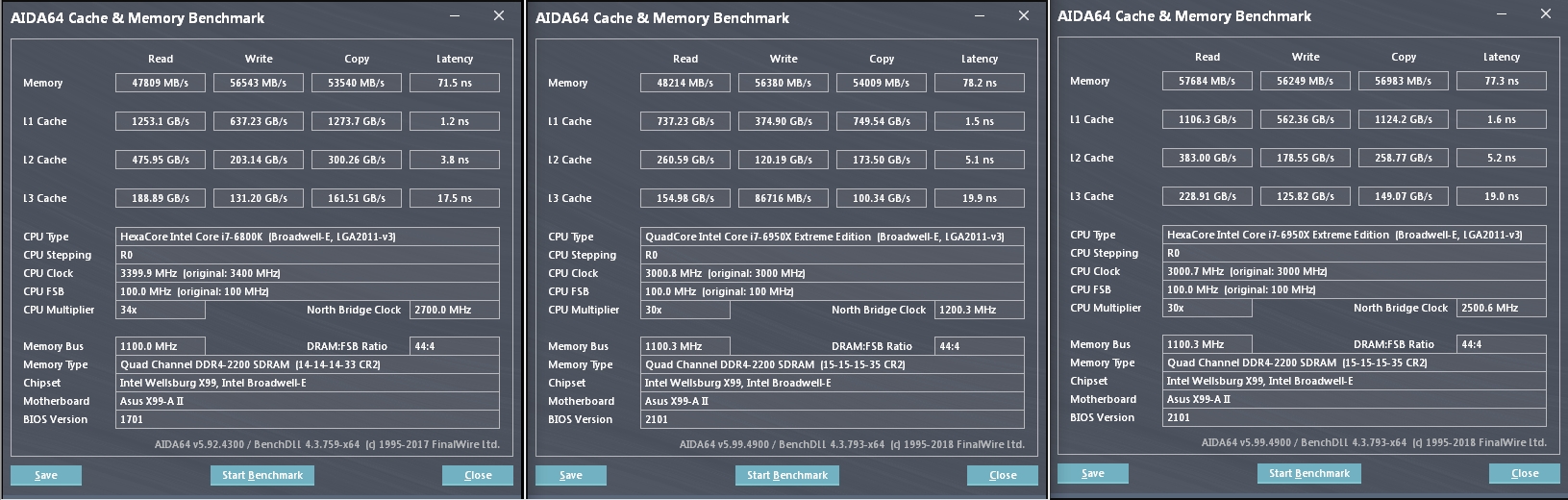 Дело в том , что на 6/12 у 6800K даже с разгоном ничего не дают , он по чтению из памяти не подтягивается до 6950X , я пытался как-то выравнеть скорости чтения на 6800К устанавливая частоту памяти 2600 и 2800 , по факту расла только скорость записи в эту самую память , а чтение самое основное всё равно плелось около 45-47 ГБ/сек... то что вы сказали про частоту контроллера , тогда вам следует объяснить разницу между 6/12 у двух ЦП ) это при том что частота ядер на 6950X на 400 МГц ниже , да и частота контроллера по-вашему мнению тоже на 200 МГц ниже. Однако ПСП на чтение у 6950X на 6-и ядрах почему-то существенно выше чем у 6800К. А ПСП на чтение у 6800К на 6-и ядрах почему-то равна ПСП 6950X на 4-ёх ядрах и это при том , что частота контроллера у 6950X при 4-ёх ядрах по-вашему ещё ниже )