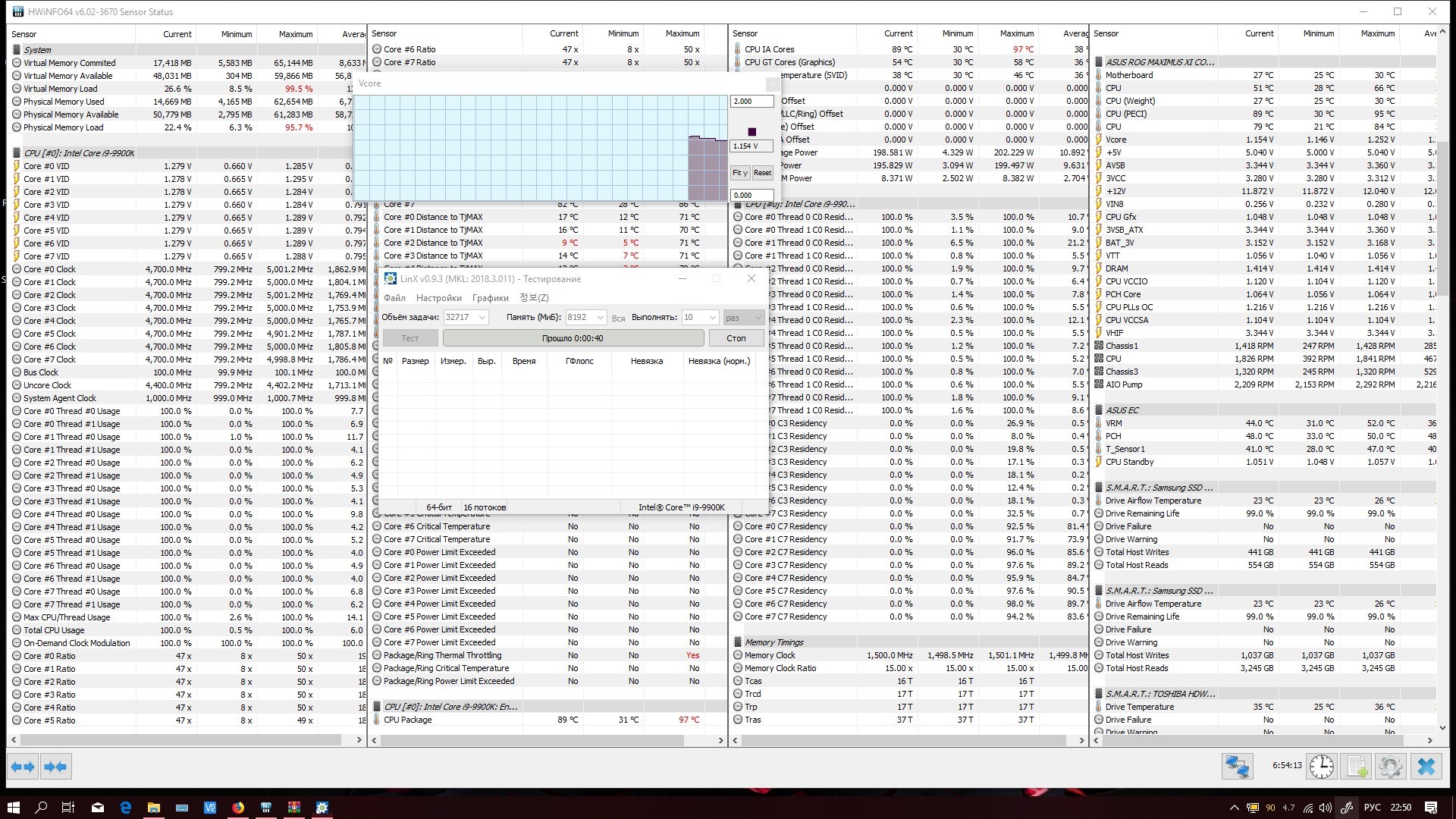 Полученный результат должен иметь следующий вид: Скриншот рабочего стола после прохождения >9 циклов (т.е. между 9 и 10 проходами). Вместе с LinX на рабочем столе должны быть развернуты CPU-Z (первая вкладка) и Core Temp, это обязательный минимум. Такой набор программ даст информацию о напряжении и температурах под нагрузкой-простоем. По желанию можете добавить другие программы, показывающие дополнительную информацию о вашей системе, например третью вкладку CPU-Z, которая покажет модель материнской платы и версию BIOS. Пример результата разгона: Mad Max, 5100 МГц (AVX 0), i7-8086K, HT-ON, Cache 4700, Vcore=1.36V, Batch L805E123, Gigabyte Z370 Aorus Gaming 7 (bios F6), Be Quiet! Dark Rock Pro 4, ЖМ под HS, Windows 10 Pro 64-bit 1809, LinX 0.9.3 64bit.