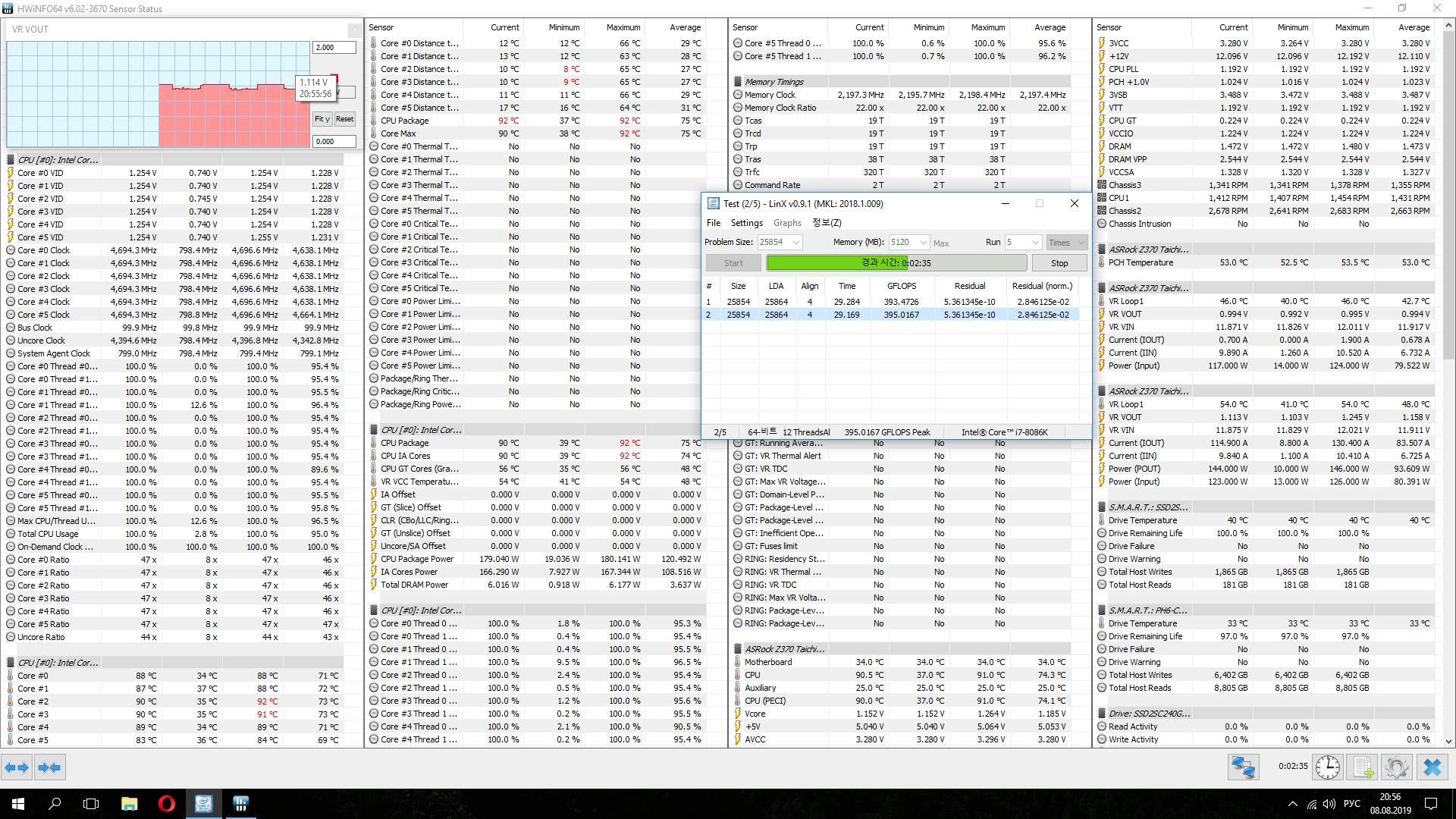 Полученный результат должен иметь следующий вид: Скриншот рабочего стола после прохождения >9 циклов (т.е. между 9 и 10 проходами). Вместе с LinX на рабочем столе должны быть развернуты CPU-Z (первая вкладка) и Core Temp, это обязательный минимум. Такой набор программ даст информацию о напряжении и температурах под нагрузкой-простоем. По желанию можете добавить другие программы, показывающие дополнительную информацию о вашей системе, например третью вкладку CPU-Z, которая покажет модель материнской платы и версию BIOS. Пример результата разгона: Mad Max, 5100 МГц (AVX 0), i7-8086K, HT-ON, Cache 4700, Vcore=1.36V, Batch L805E123, Gigabyte Z370 Aorus Gaming 7 (bios F6), Be Quiet! Dark Rock Pro 4, ЖМ под HS, Windows 10 Pro 64-bit 1809, LinX 0.9.3 64bit.