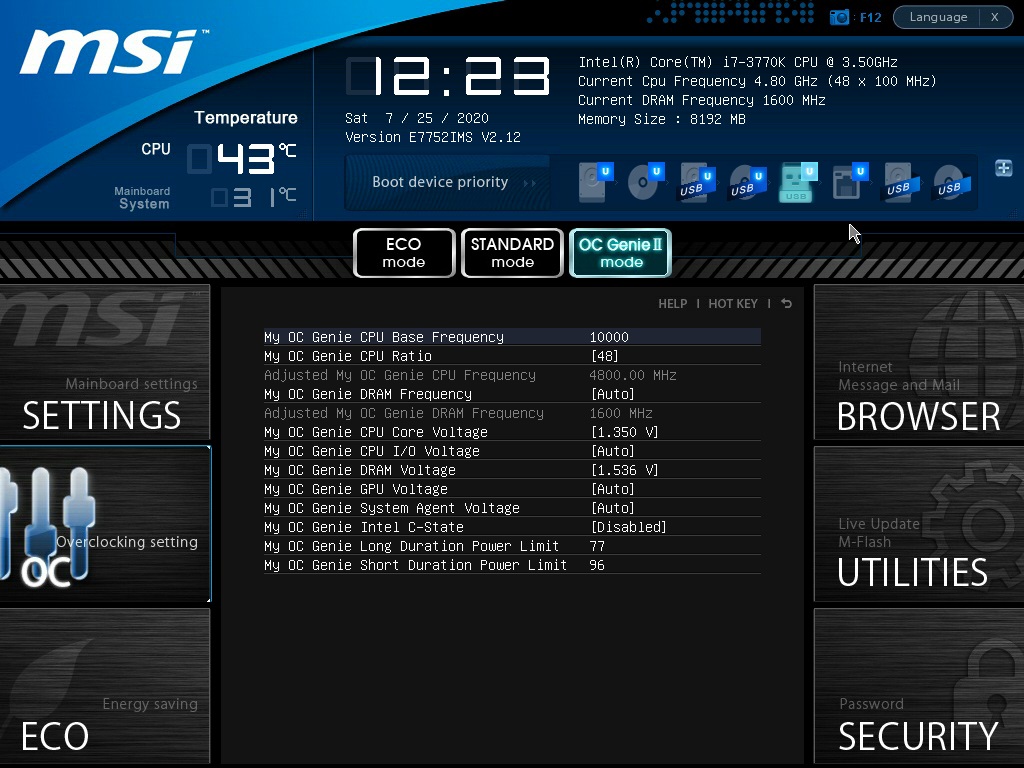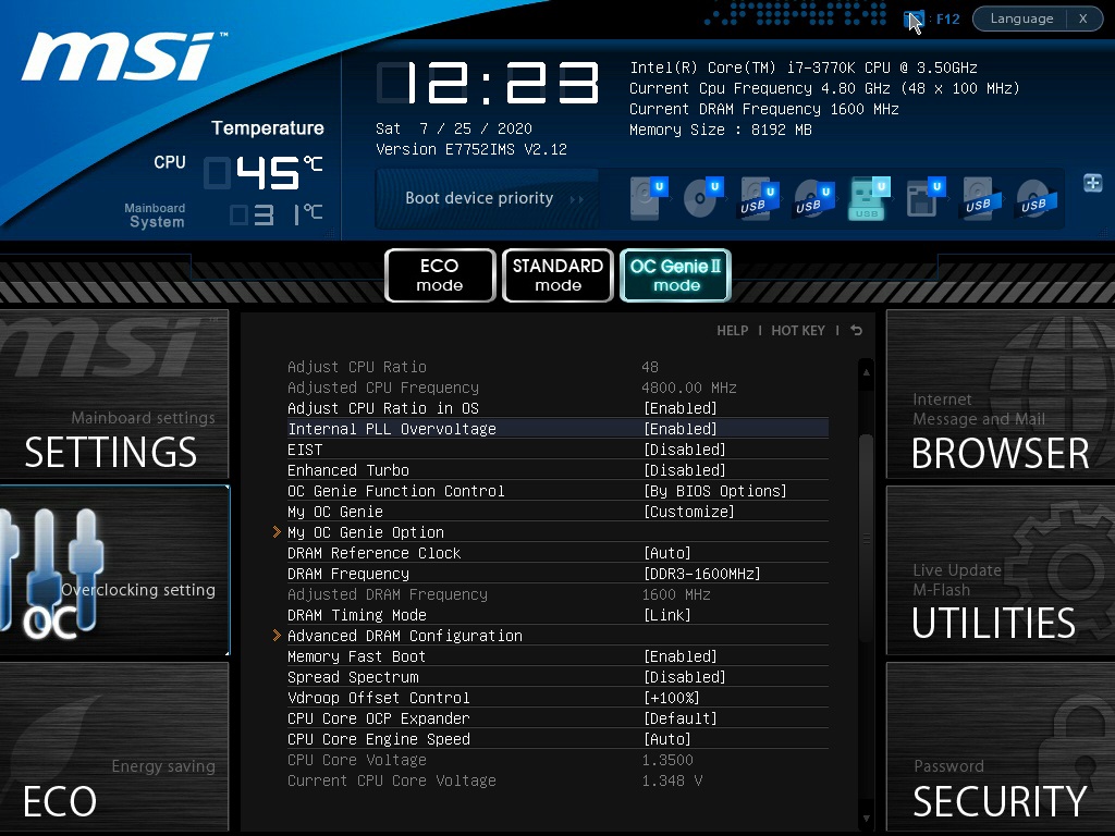 Скальпанул проц с алика-получил -25 градусов. Под крышкой термопаста была полностью твердая. Конфиг: i7 3770k, deepcool lucifer v2, msi-z77a-g45, rtx 2070s, ddr3 8 1600, Проц взял 4.8 на 1,35. Все бы ничего, все тесты проходит, бсодов, whea-logger'ов не видел. Но в биосе cpu core voltage 1.350, в простое в винде 1.336, под нагрузкой 1.312. Нормально ли это при llc=100%? 1) Судя по скринам, что можно еще подкрутить в биосе для более надежного разгона? 2) На моей материнке можно ли поднять напругу оффсетом? Че-то не нашел. 3) CPU I/O Voltage - стоит в авто. Что это? Стоит ли трогать? 4) У меня совсем слабая оператива, еле-еле берет 1800. Хочу взять топовую с возможностью разгона до 2400+, но планки упираются в вентилятор кулера, так что нужна низкопрофильная. Что посоветуете? Как вам такая? продается новой https://market.yandex.ru/product--opera ... &text=ddr3