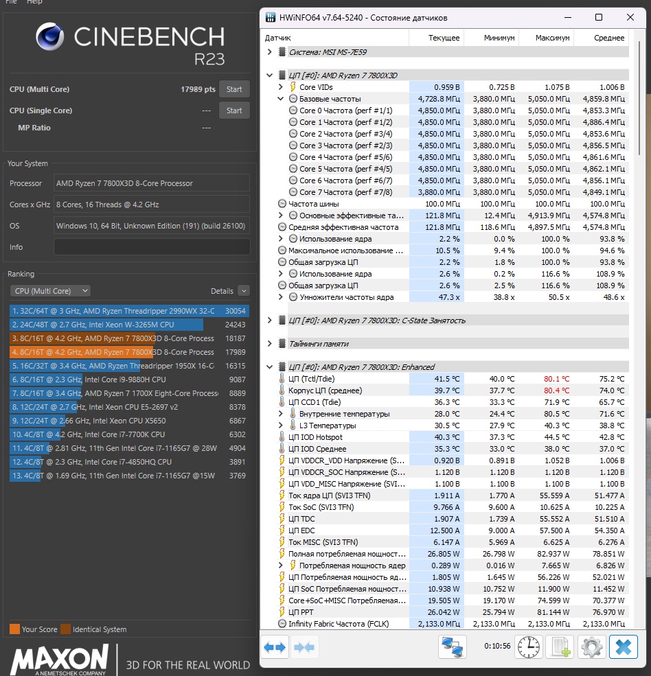Тест в cinebench23 с Scalar=x1 и boost clock +200: