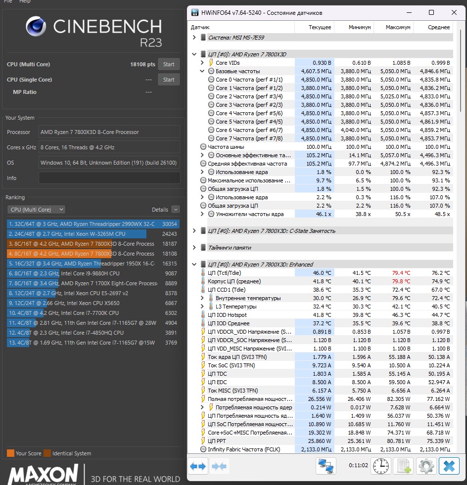 Если смотрите на среднее, то это с учётом до и после теста. Вот как выглядят показатели во время теста, и это я Curve уже сделал до -30 (Julia 5 раз запускал, комп не выключался):