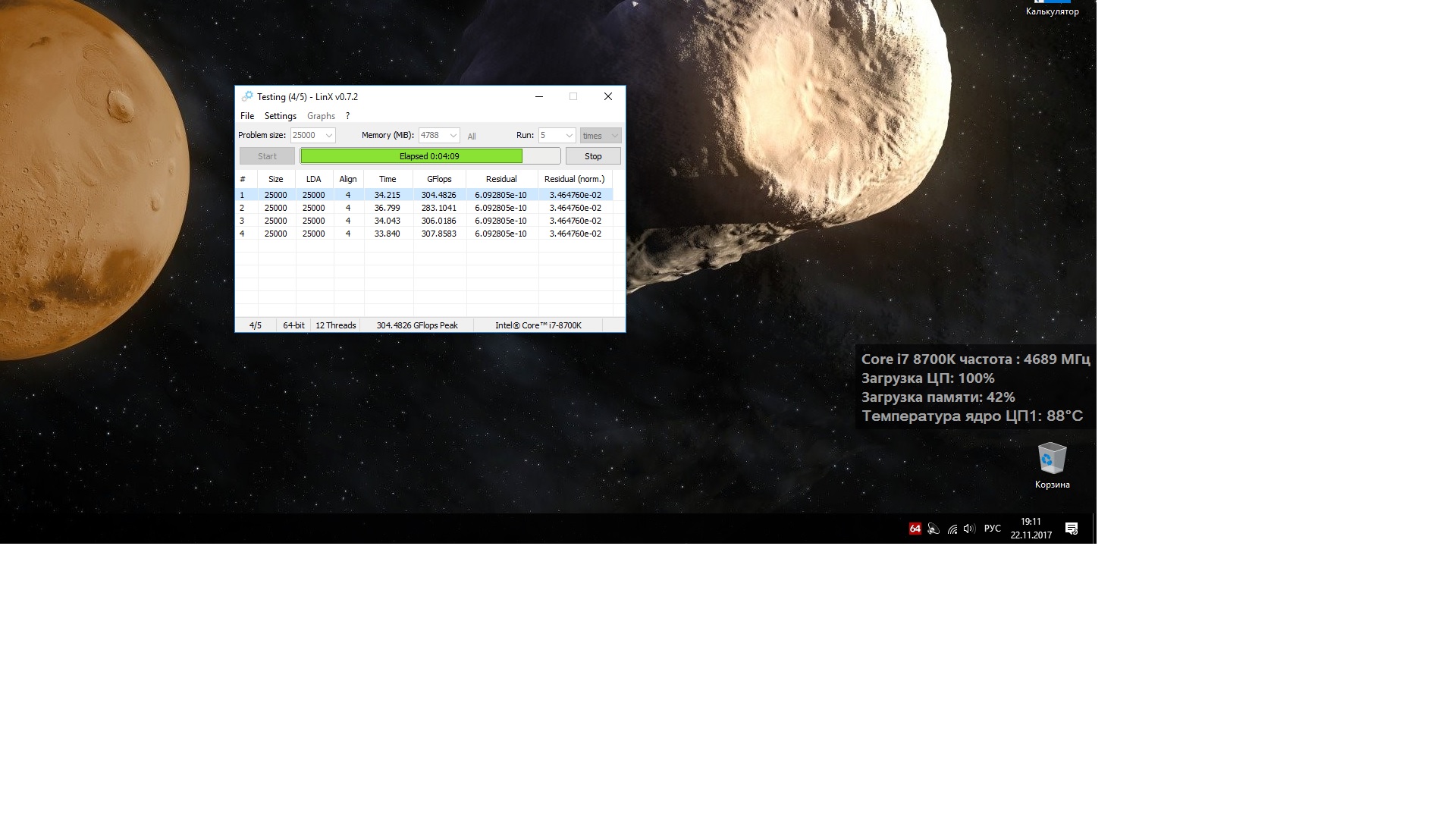 LinX должен быть настроен следующим образом: Задаете режим 32 либо 64 бит, объем задачи = 25000 (не меньше 25000), количество проходов = 10 (не меньше 10).