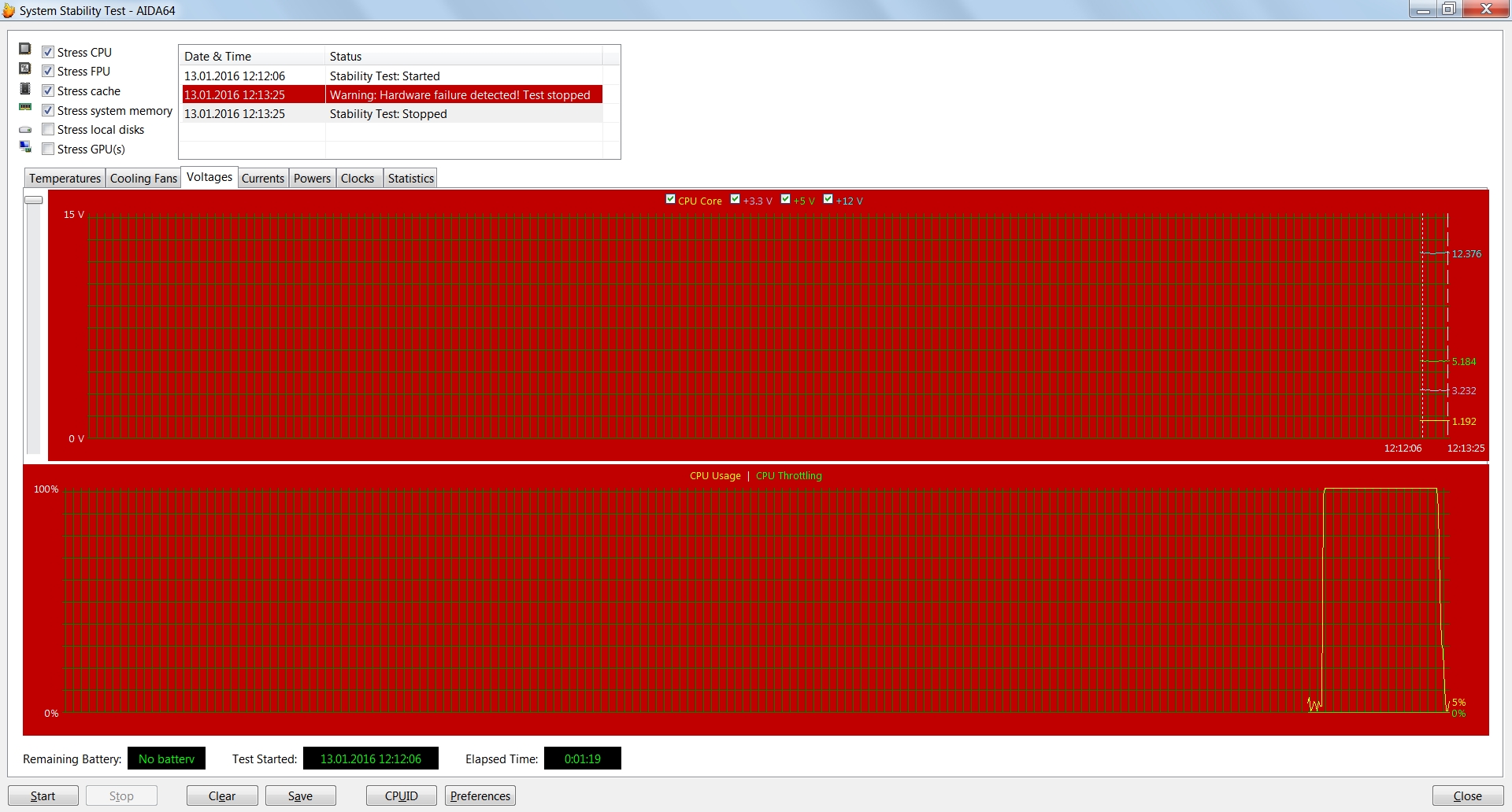 Не понял про 1 и 2a. Попробовал и 1,3В и 1,25В - тест валится также быстро.