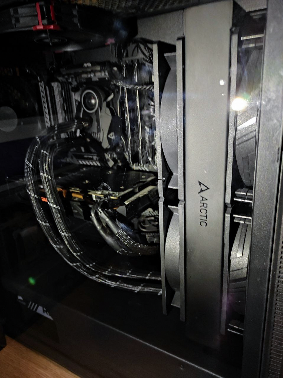 Сделал таки Push/Pull...до этого было 3 вентилятора, один был напротив видеокарты, теперь все 4. Pull - родные, Push - Cooler Master SickleFlow 140 ARGB. Поднял напряжение памяти до 1,48...CL снизил до 16 и память начала в ТМ5 греться до 48С...поэтому решил добавить четвертый. Я думаю тут видна разница между толщиной вентиляторов (25-27мм) и толщиной радиатора (38мм), а то многим не понятно за что арктик берут деньги. Ну и срок гарантии...ID Cooling дают 2 года на все серии кроме DASHFLOW, на нее 3, Deepcool дают 3 года....арктик дают 6 лет гарантии на свои СЖО.