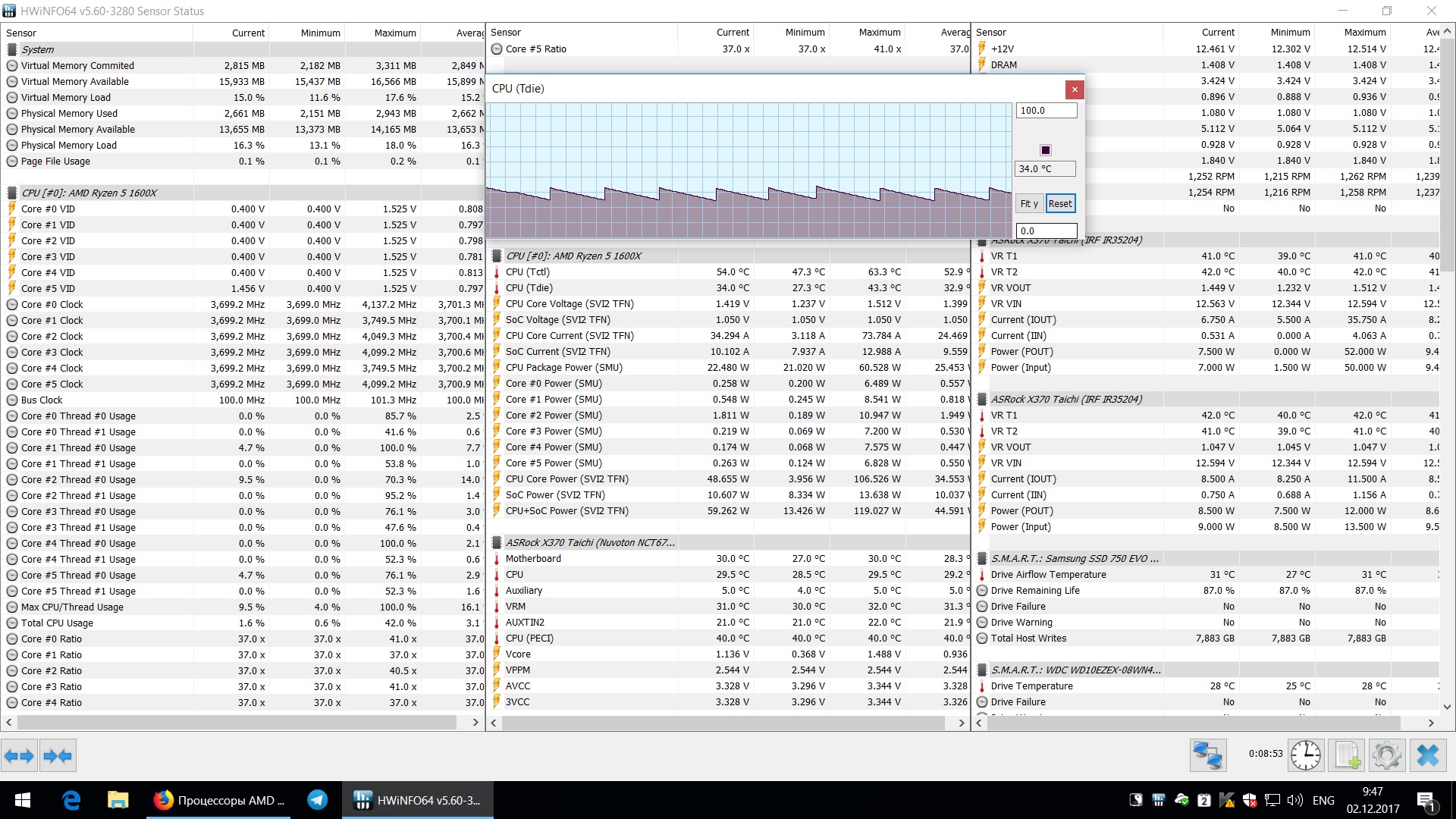 В простое: Постоянные пики 40-30 градусов (видимо работа буста до 4100 мегагерц на ядро, сопровождаемая скачками напряжения до 1.5)