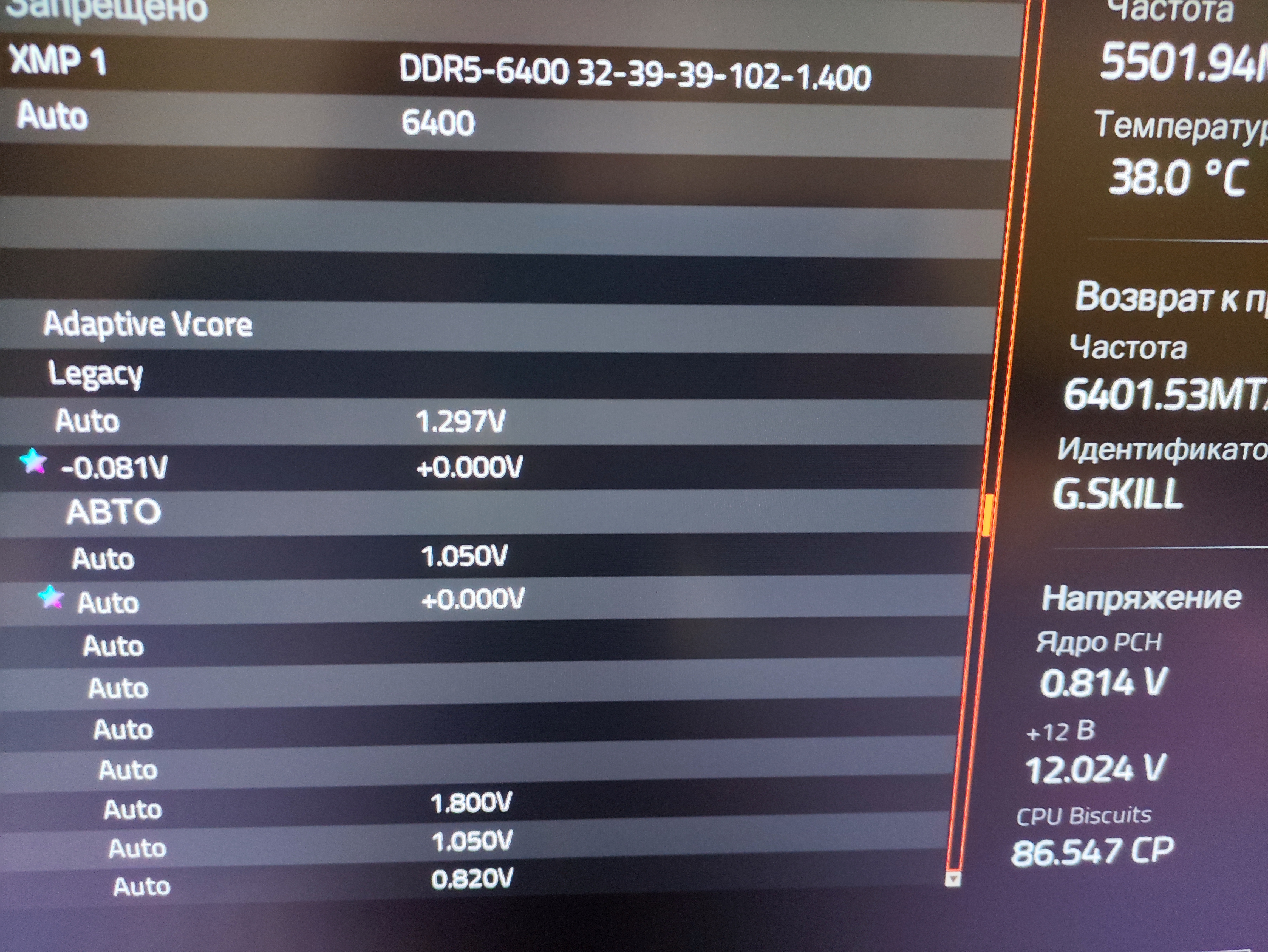 HertZ Вчера словил серьезный глюк, проц в разгоне Р5500 и Е4400, лимиты сняты отключен андервольт, tvb, cep; avx 0, Ac LL 0.01, Dc 0.5., LLC максимальный 3, Core limit 511.75. В кранчере, синебенчах 15 екстрим и 23 Vids был 1.98, Vcore 1.92. в простое максимум. Тесты все на ура, в осст мах потребление 208 на avx2. Поиграл пару часов в 4к, шумновато, мониторил темп 67, потребление в районе 100w. ВКоре и Видс 1.240 где то, в игре. Снизил частоту до 5400-4300 остальное осталось неизменным. Включил фильм hdr 4k часа через 4 после игры, в процессе вылетает синий и резкий ребут сразу в винду, даже таблички входа в биос не появилось. Я включаю hw и запускаю r23 и летят температуры 95-99 красным, вода на взлет х3 140мм. Отрубаю тест, смотрю у меня Vids 1.48, в простое и vcore 1.2 (был 0.800). Перезапуск, снижаю частоты на сток ф10. Такая же хня. Снизил лимит коре с 511 до 300, включил tvb и андервольт настройку, и все стало норм. Что это могло быть?
