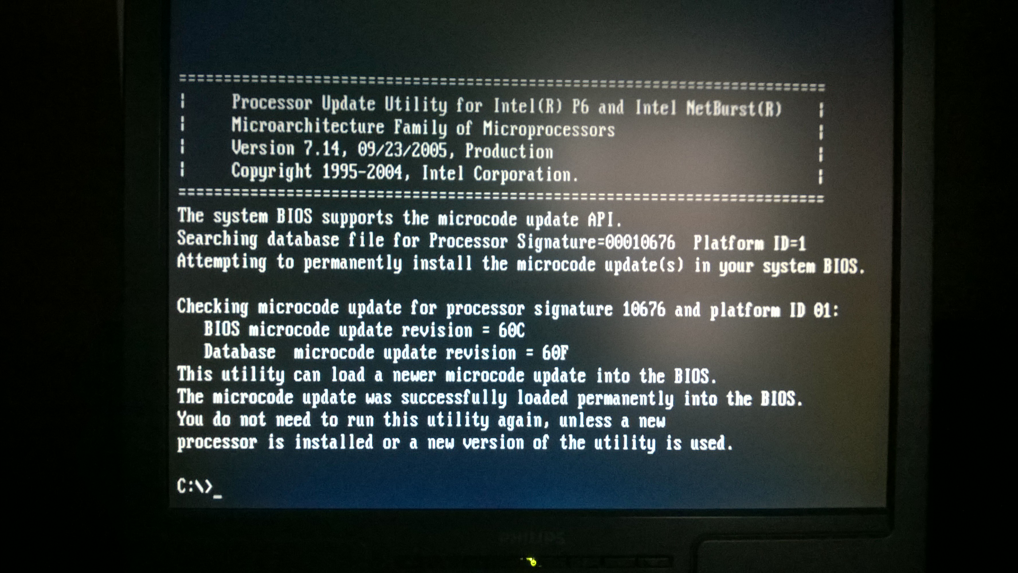 3. После выполнения команды мы видим, что CPU ID и версия микрокода определены верно и что в файле, что мы указали утилите более новая версия микрокода. Однако утилита уже давольно старая и определяет процессор как Pentium III, на это внимание не обращаем, так как это всего лишь интерпритация прогрммы, главное чтобы CPU ID в версия микрокода определялись верно.