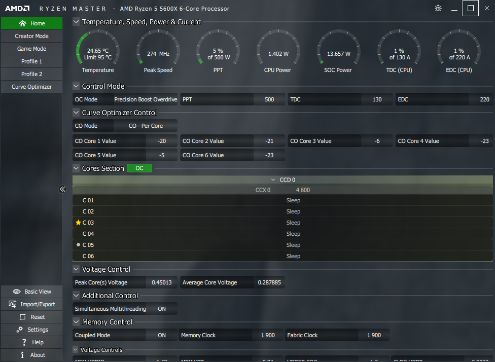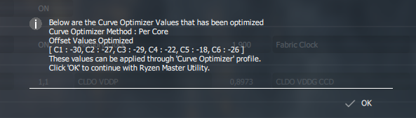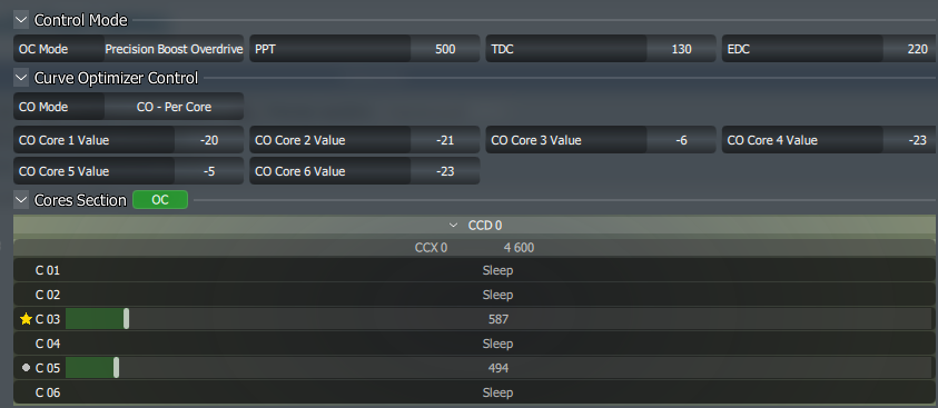 CURVE OPTIMIZER values for BIOS (If you do not plan to use HYDRA) C01 SAFE CO: -4 FAST CO: -10 C02 SAFE CO: -2 FAST CO: -7 C03 SAFE CO: -11 FAST CO: -16 C04 SAFE CO: 2 FAST CO: -3 C05 SAFE CO: 5 FAST CO: -1 C06 SAFE CO: -7 FAST CO: -13