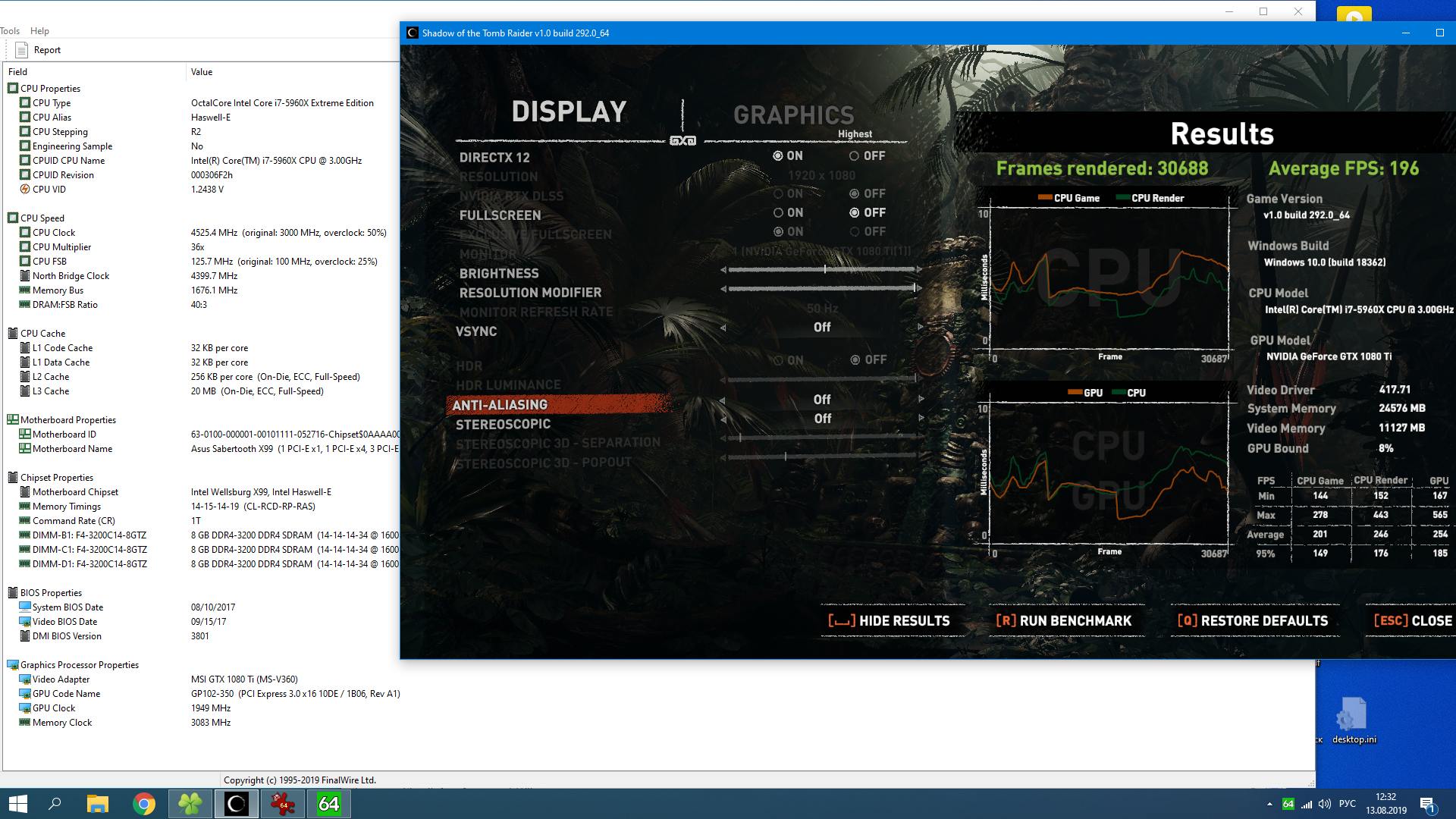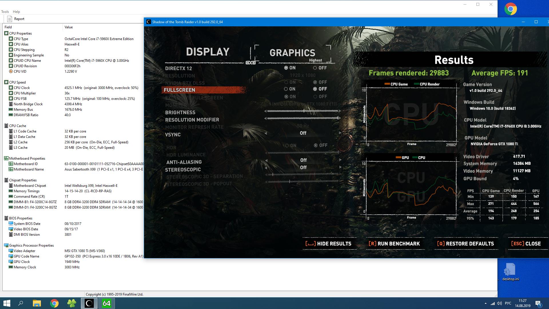 Короче, чё-то типа того получается. Кэш, если накинуть ему 0.1 вольта, держит даже 4.25, выше не пробовал, но вряд ли уже. Память, если подправить вторичные тайминги никакого буста не получает, разве что задержка снизилась на 1 ns, но это вообще мелочь, поэтому вернул все кроме основных таймингов в авто. Другие тайминги вообще по калькулятору в два раза больше получаются чем ставит материнка в авто, их не стал трогать. Ларку тестил в 800х600 еще с 4.12 кэшем, но не думаю что он сильно бы повлиял. В dx11 фпс пониже чем с 12. Ну не знаю, как по мне, такой себе результат (или норм?). Приедет память нормальная, еще че-нить потестим.
