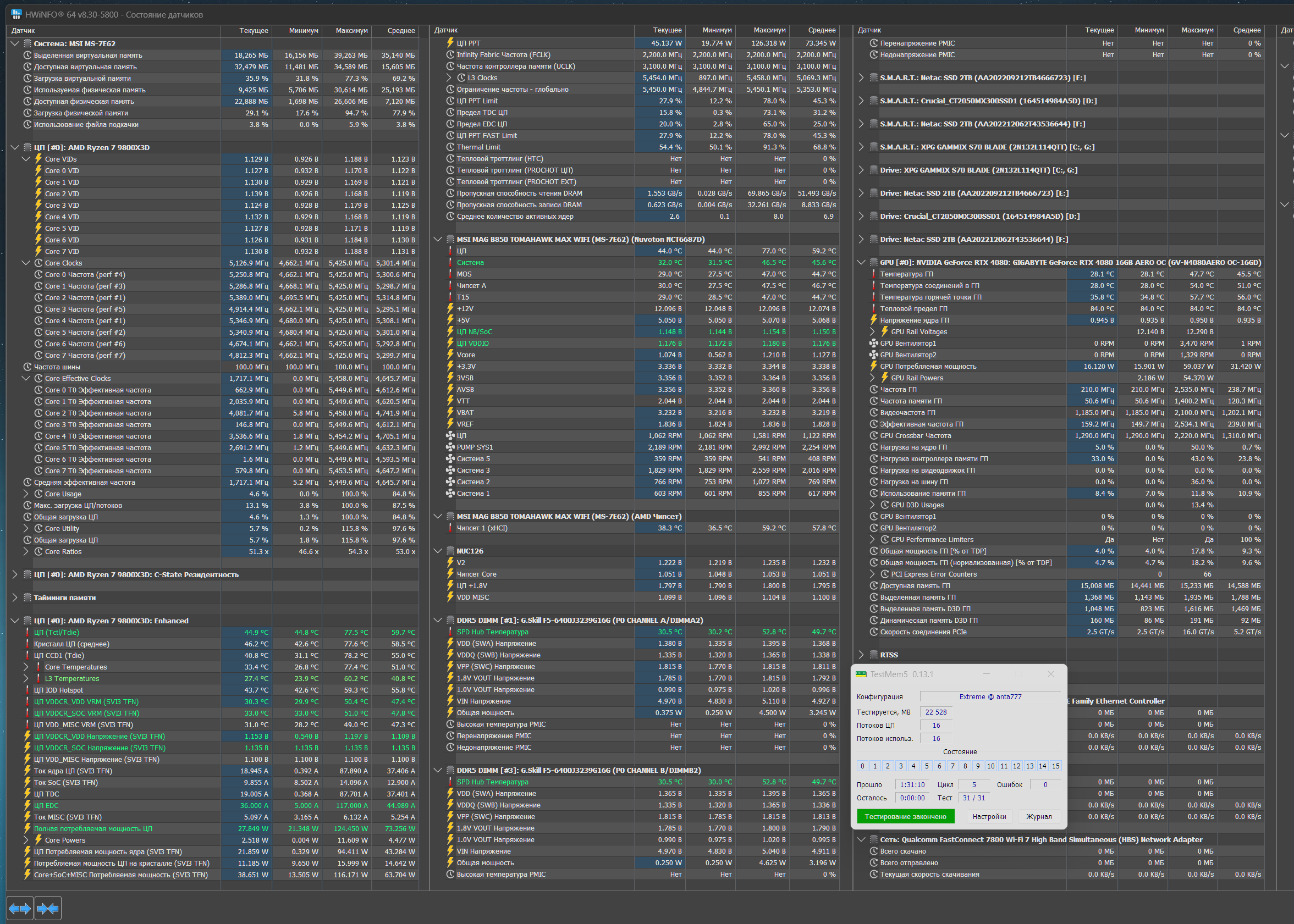 По итогу: проц холодный, стабилен во всех тестах при CO -30, так же при частоте памяти 6200 1:1, FCLK едет 2200мгц при 1.13v