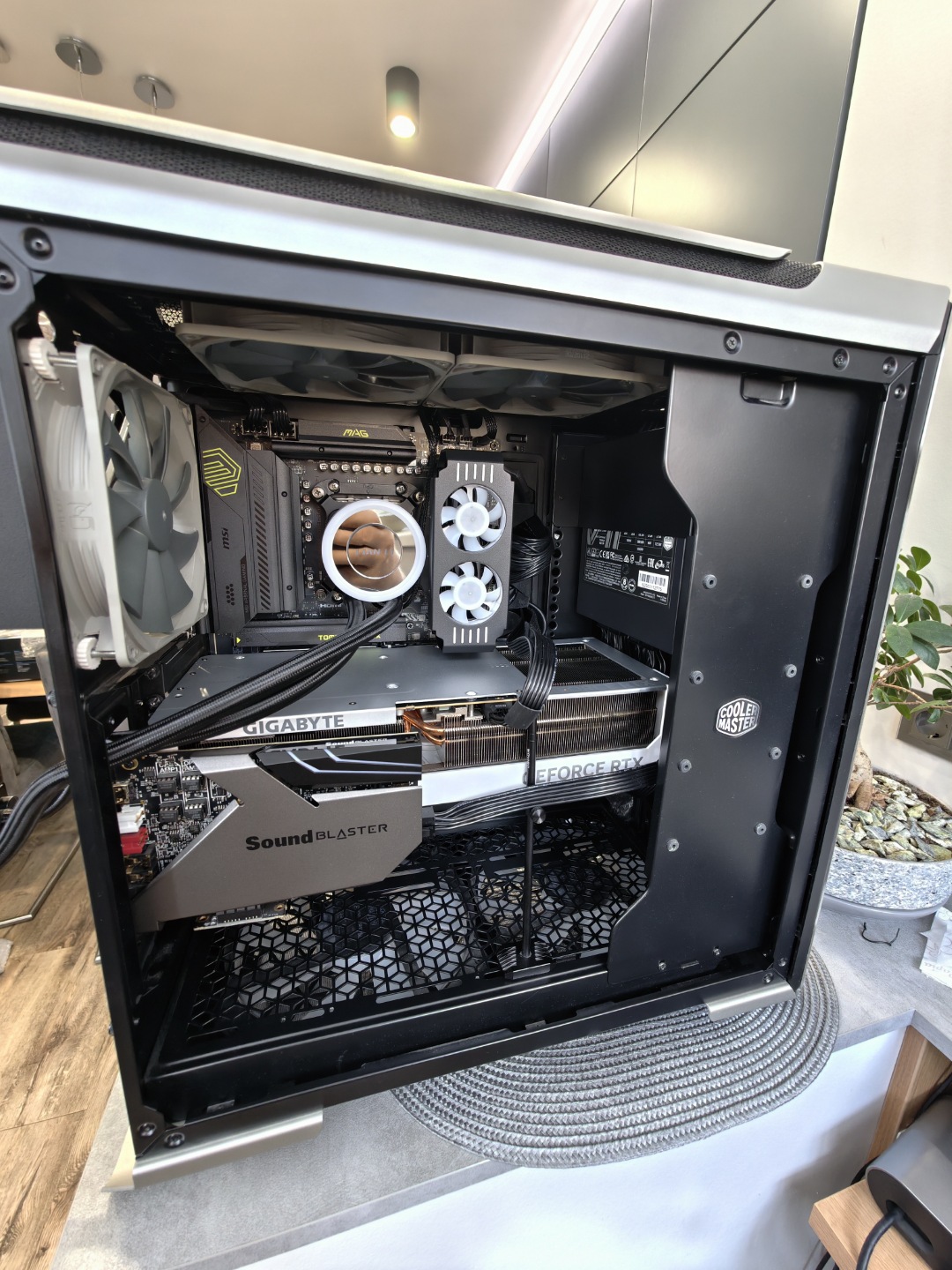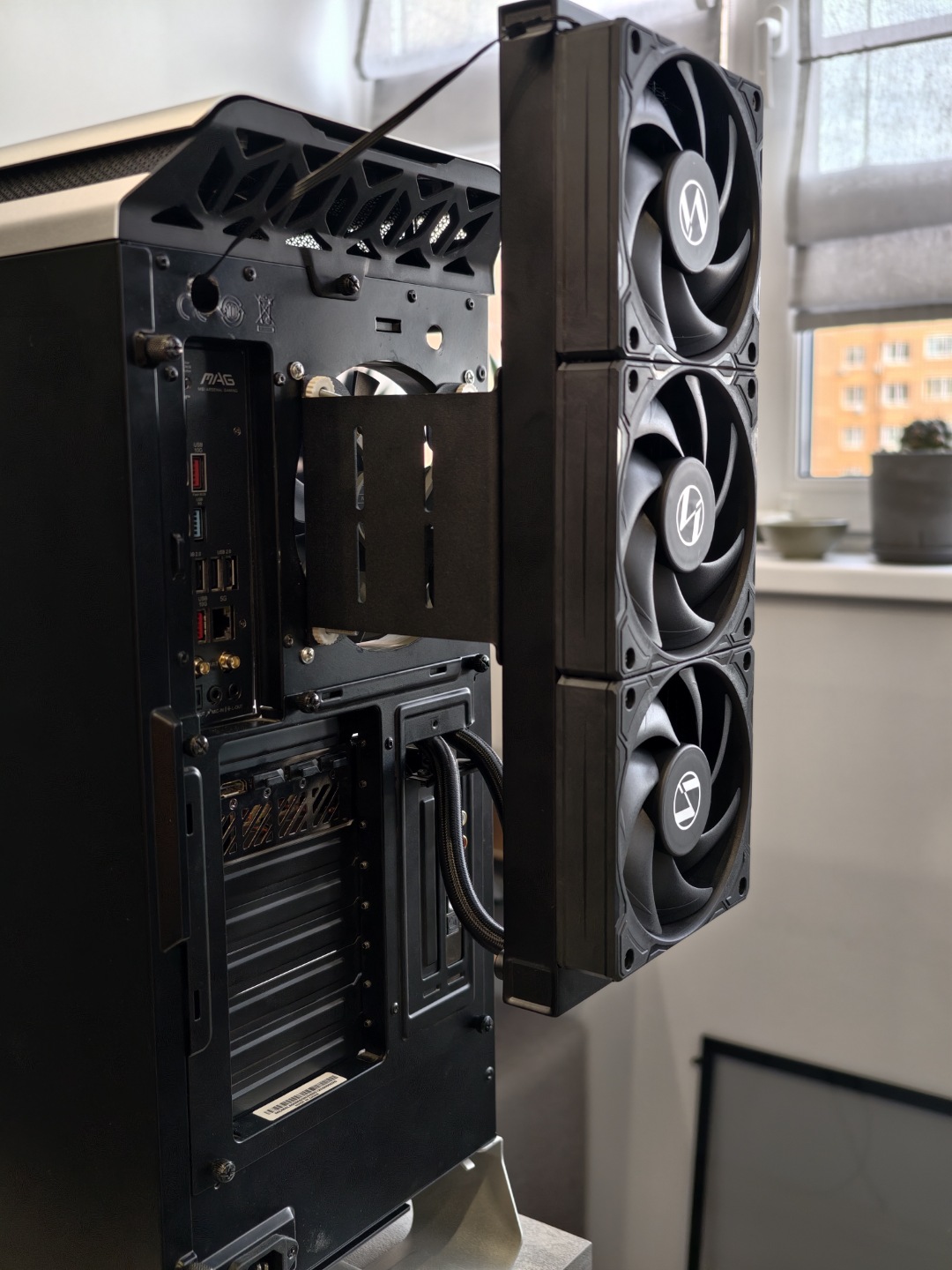 Ты писал выше, что мол это попробуйте и ваши СО повылетают, что это тогда? Вот так все стоит, осталось от прошлой водянки и горячей 3080ti в свое время, которая нагревала радиатор вверху (и только туда его можно поставить) и проц закипал, пришлось вынести радиатор за корпус, так и стоит. Но корпус под столом, как бы фиолетово, что там сзади.