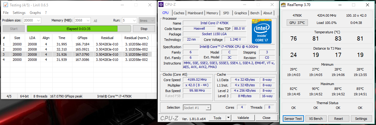 загрузил настройки 4690К, но множитель на 43, напряжение 1.205V, тест LinX прошел (5 проходов), температура до 96С, при этом в CPU-Z напряжение поднималось до 1.240V. Gflops -188-191. во время теста, система на несколько сек подвисает, это тоже норма?