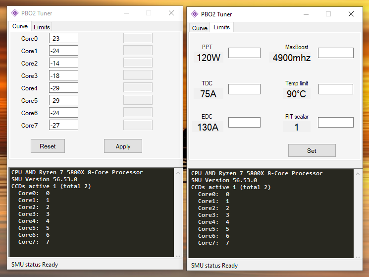 Лично я выставил сразу лимиты по максимуму что может VRM материнки и сколько может переварить охлаждение. Precision Boost Overdrive Scalar чем больше значение, тем позже и менее агрессивно процессор сбрасывает частоты после того как пропала нагрузка. Выставил на максимум. Что касается Load-Line Calibration то для всего кроме VCore выставляю в самое агрессивные значения, хотя и для VCore тоже. Precision Boost берёт во внимание показания именно мониторинга, а не запрашиваемое значение. Мониторинг материнской платы читается Precision Boost`ом через такой протокол как SVI2 TFN. Технология заключается в следующем: 1)выставляем Желаемый VCore Offset, если выставляем его в сторону увеличения, то малопоточная производительность будет выше, если в сторону уменьшения то многопоточная производительность будет выше. Под каждую настройку VCore Offset надо подправлять значения Curve Optimizer, 2)сначала для всех ядер уменьшаем Curve Optimizer, 3)запускаем скрипт, упомянутый выше, повторяем шаг номер 2, пока ни начнёт вываливаться ошибка на одном или нескольких ядрах и откатываемся на один шаг 4)запускаем после этого Cinebench R20, с большой вероятностью система просто перезагрузится, это по большей части лечится добавлением CPU PLL напряжения с 1,8V, но не превышая 1,9V, хотя от чрезмерного напряжения PLL может начаться обратный эффект и стабильность пропадёт, 5)далее начинаем настраивать Curve Optimizer для каждого ядра отдельно и проверяем стабильность как в шагах 3-4.