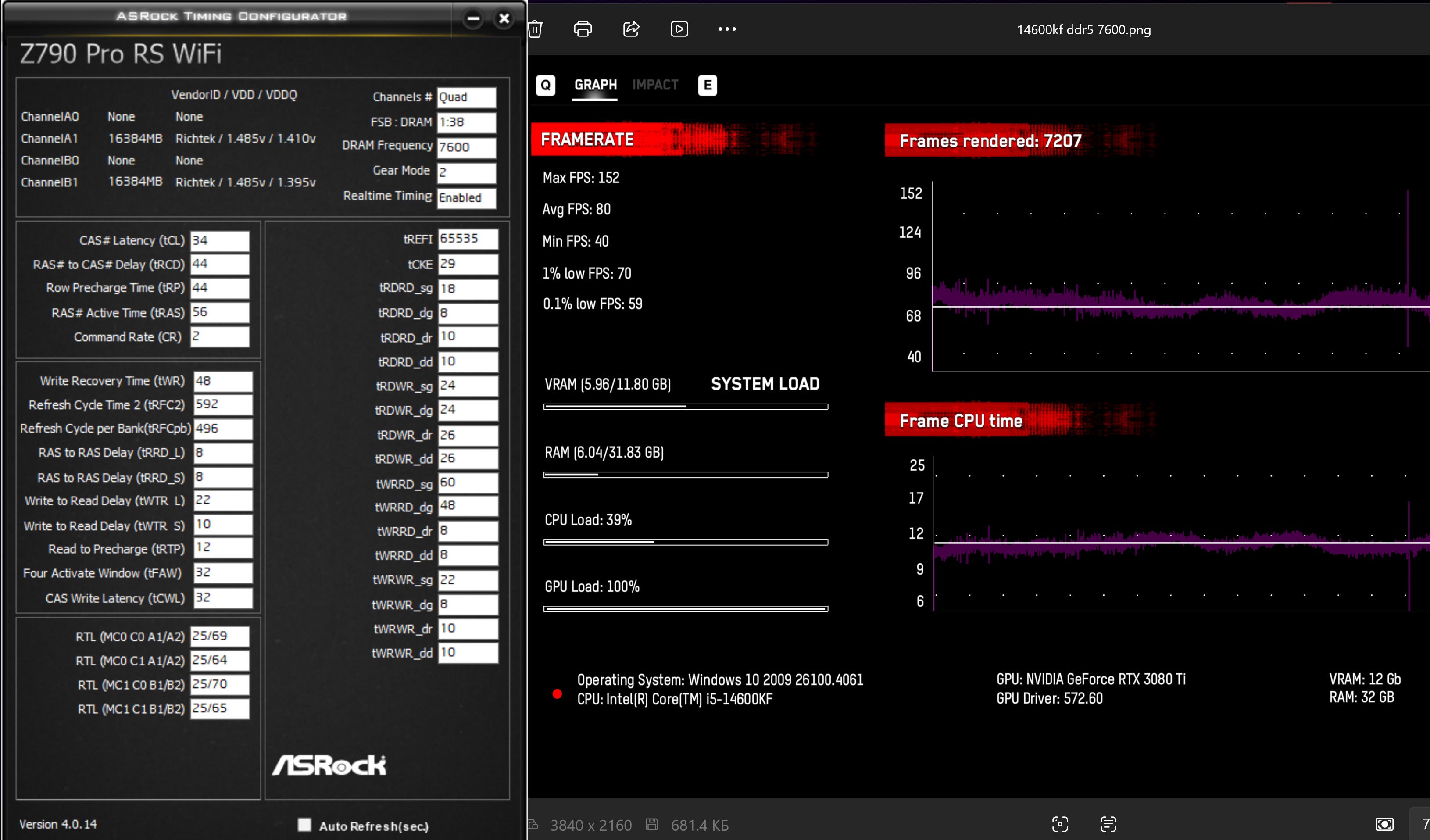 До недавнего времени был счастливым обладателем i5 12400f (5200Mhz) + ddr4 3400 (14-18-18-34), вк осталась прежней 3080ti Suprim. С переходом на ddr5 (7600 34-44-44-56) и проц 14600kf, разницы можно сказать не увидел в играх и тестах графена (по крайней мере в 4К), но может с более продвинутой ВК будет заметна. Причем первоначально, без настройки кропотливой памяти ддр5, было дно полное по 1 и 0.1% и min fps (на скрине с пометками). На мах фпс можно не смотреть, он прыгает в этом тесте, и на 12400 доходил до 160+