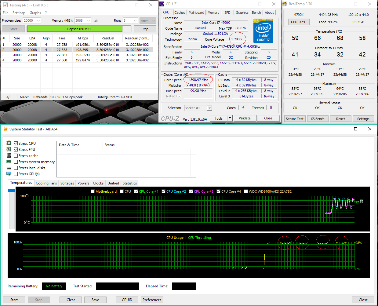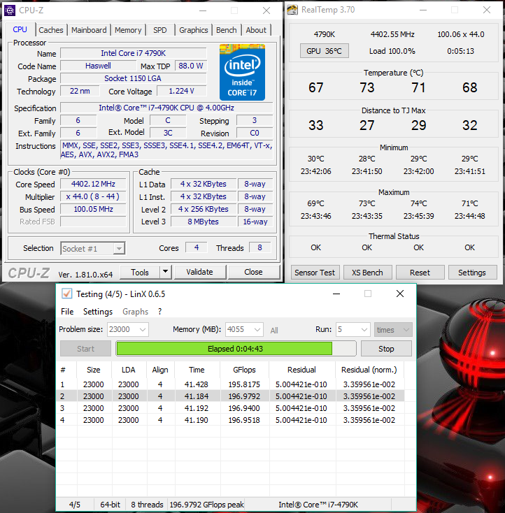 Сделал сегодня скальп, применил настройки разгона 4690К (скрин 1, скрин 2), поднял напряжение до 1.200? кольцевую шину в 40, , применил рекомендации по отключению энергосберегаек, в итоге получилось так: