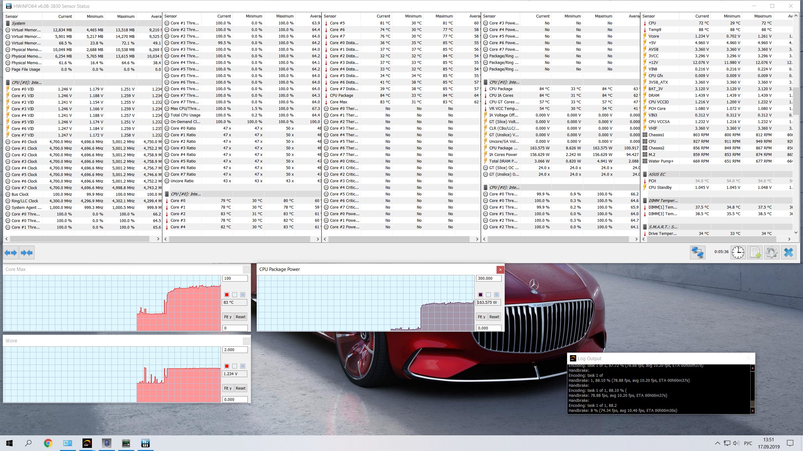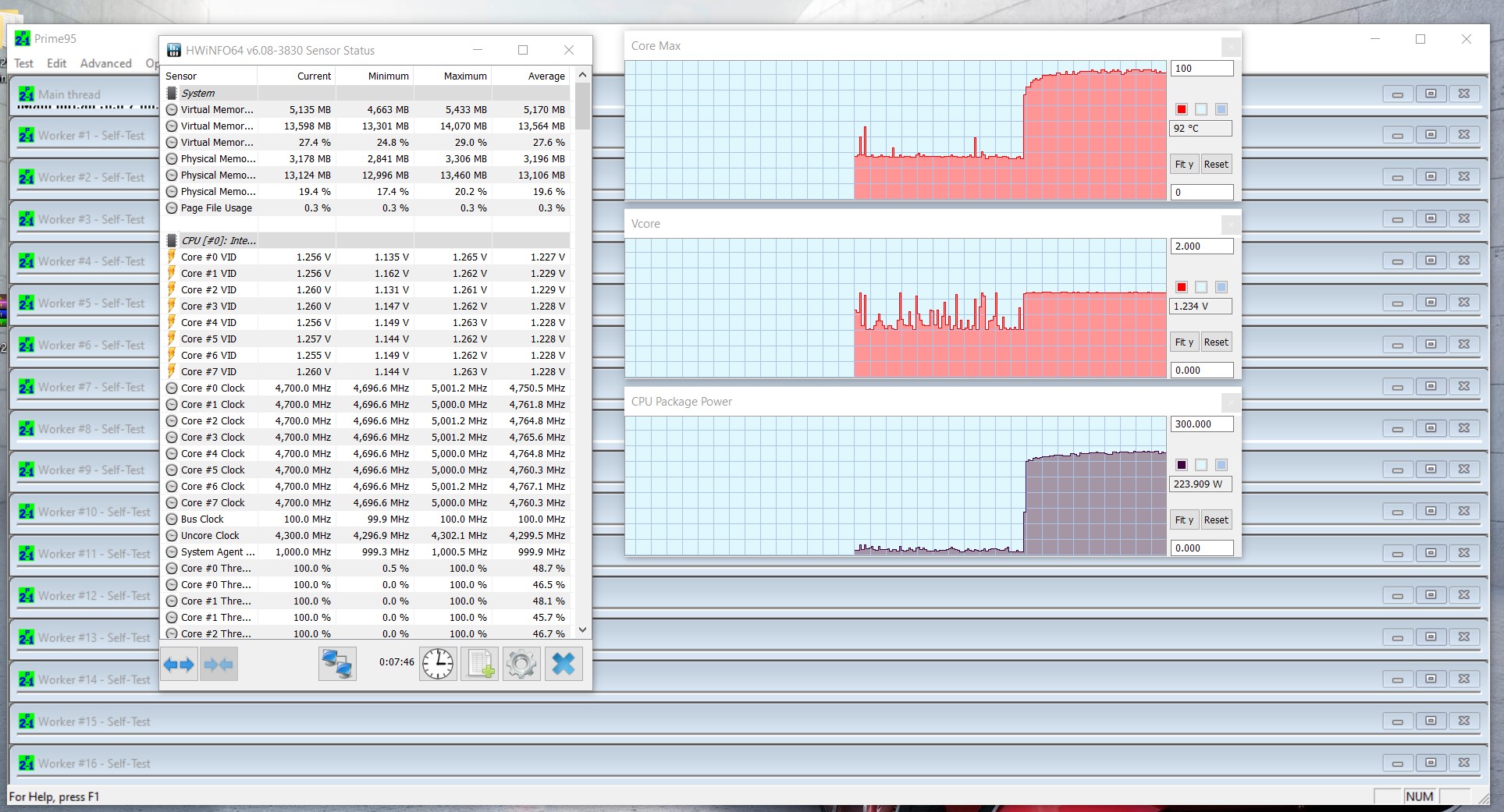Предельные значения температуры и энергопотребления разогнанного Intel Core i7-9700K при прохождении тестирования в Prime95 29.4 (при полной восьмипоточной нагрузке SmallFFT c AVX, охлаждение Corsair Hydro Series H115i)